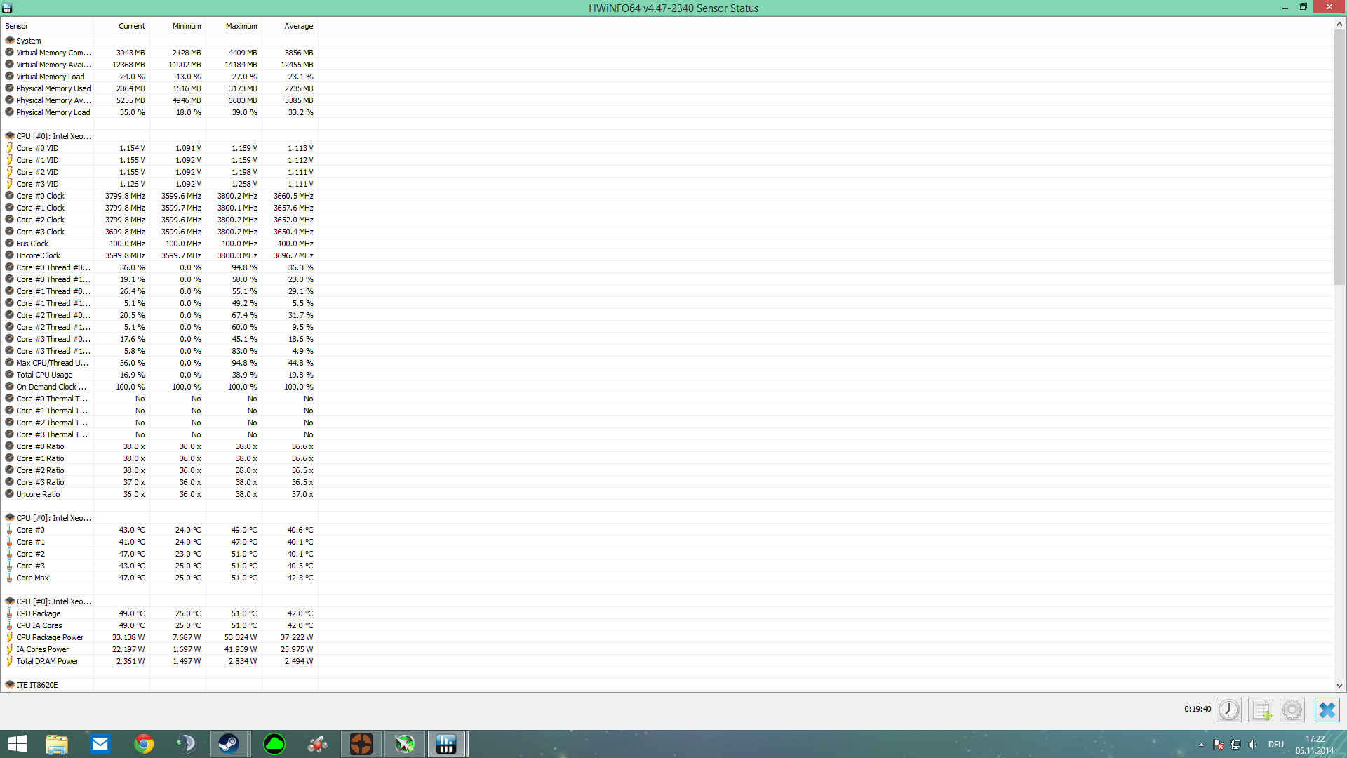 Die Core Last betrug Average maximal 19,8% (Laut Screenshoot) daher sind auch die Temperaturen Verhältnis mäßig niedrig.