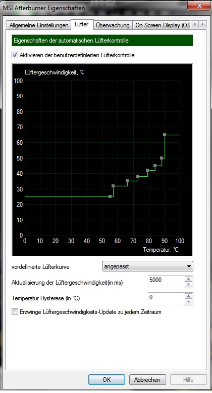 Danke erst einmal für die Lüfterkurve. Irgendwie verstehe ich das ganze nicht so ganz, vorher als die Lüfterkurve höher eingestellt war bin ich so auf 70-75°C gekommen, jetzt drehen die Lüfter langsamer und die Temperatur ist niedriger (so bei 65°C ab und zu bis zu 70°C). Also vielen Dank für die Hilfe:)