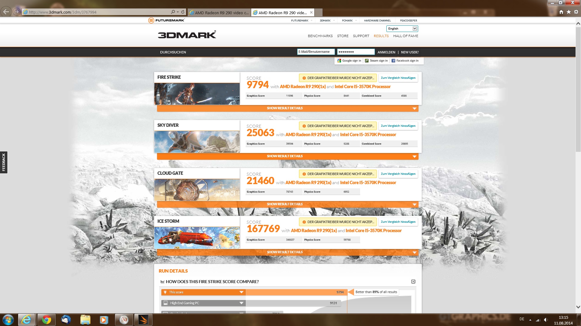Hab den 11er kurz installiert, durchlaufen lassen und wieder deinstalliert. Ich hab nur einen I5 3570K @4,5Ghz und nur eine normale R9 290 Vapor-X Tri-X OC. Ich komme auf ca. 13200...