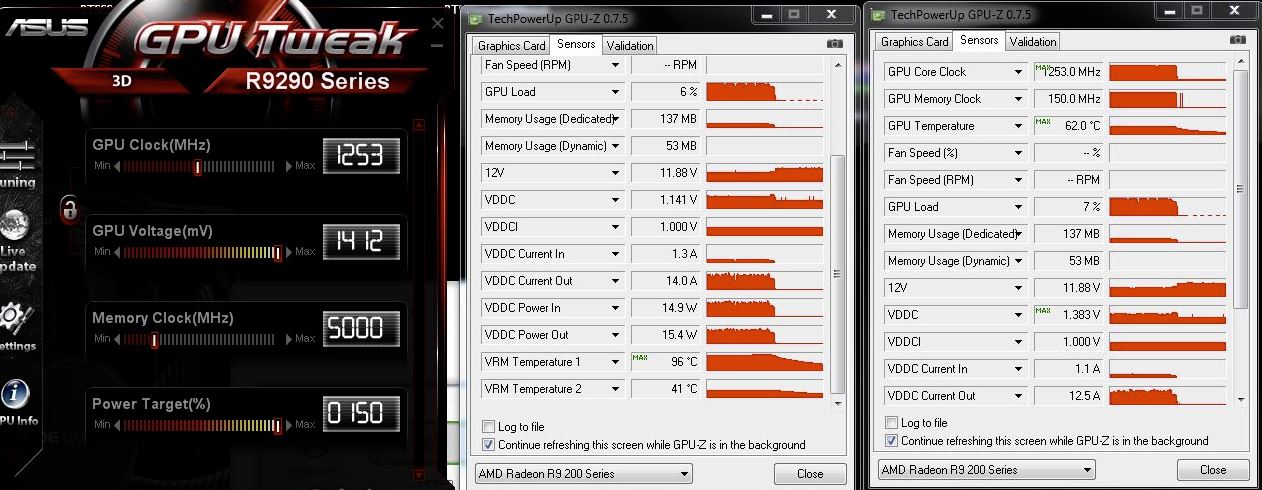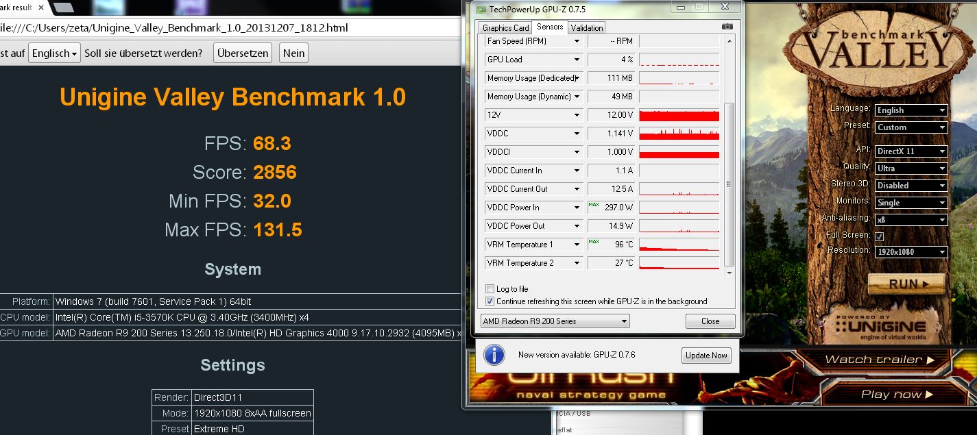 Die Grafikkarte war urspürunglich eine R9 290 von XFX, habe sie aber zur 290X flashen können und betreibe sie mit 1150/1350MHz, +100mV Core-Spannung und +50% Power Limit. Die Temperatur erreicht dabei nie mehr als 52°C.