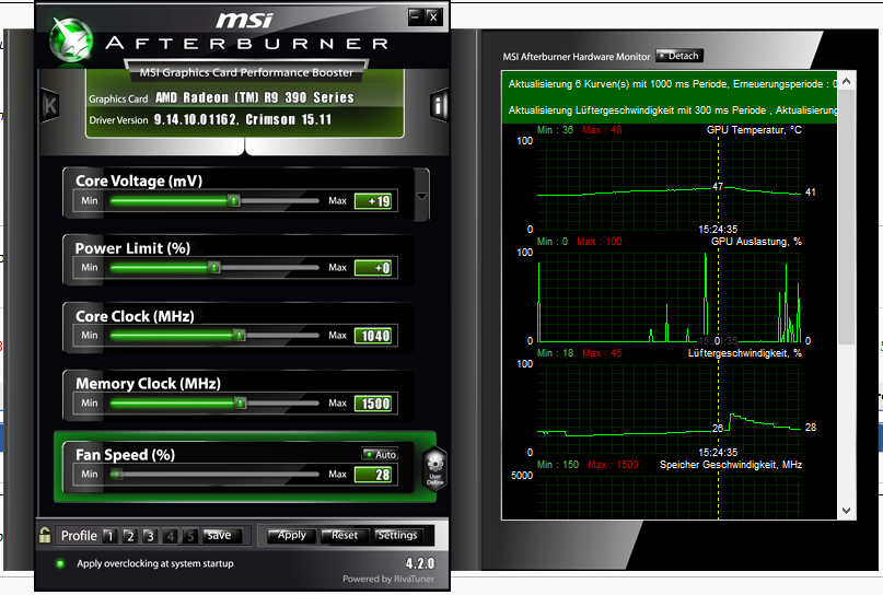 19 mV : max temp: 76°C, Lüfter max. 53% Last: