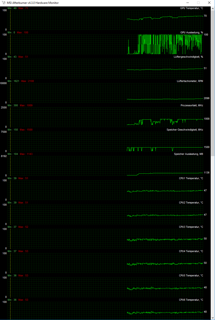 Es ist nicht beliebig reproduzierbar, beispielsweise kann der Furmark 30 Minuten rennen (GPU maximal 75° C) ohne das es Beschwerden gibt, dann wieder wahllos bei einem Start des Stresstests macht er sofort die Grätsche. Dasselbe gilt für Spiele, welche eine hohe GPU Last anlegen und auch der CPU (maximal 54° bei den aktuellen Temperaturen) gut was abverlangen.