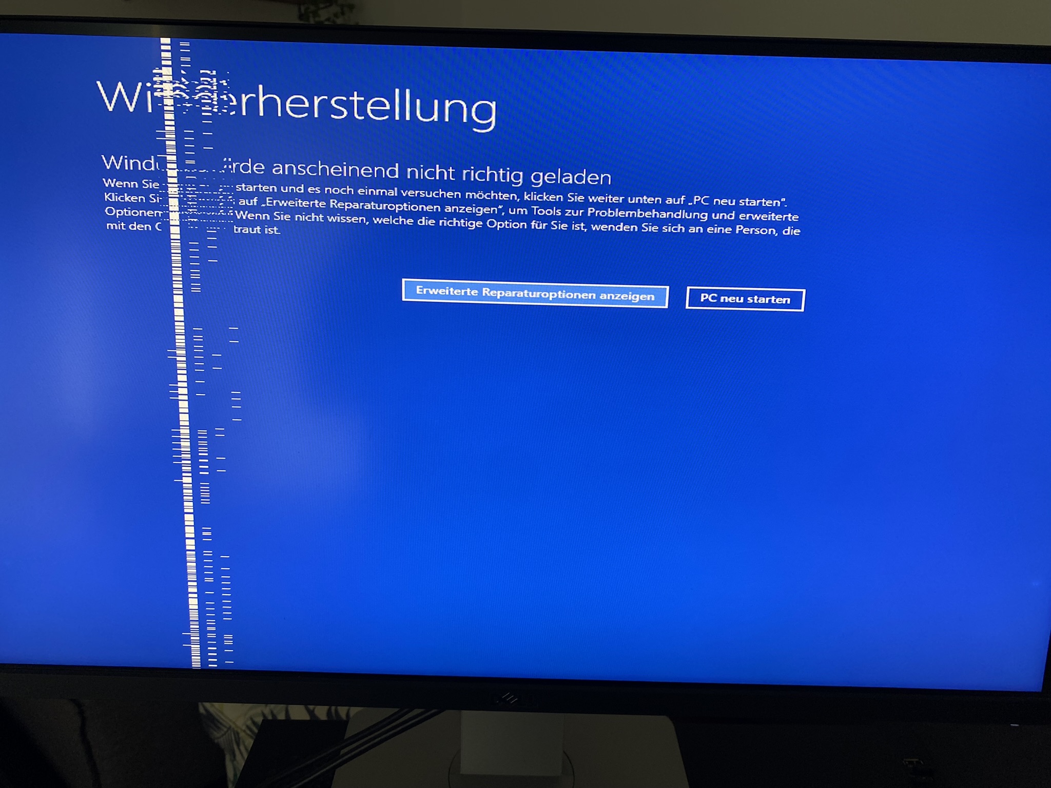 Habe den Innenraum mal ordentlich gesäubert, Steckverbindungen überprüft etc - keine Änderung. Dann habe ich Schritt für Schritt einzelne RAM Riegel entfernt und bekomme dann immerhin ein Bild (allerdings nur über DP - nicht über HDMI), allerdings auch nur fehlerhaft angezeigt und mit dem Hinweis "Windows Fehler" - siehe Fotos. Komme also gar nicht in Windows rein.