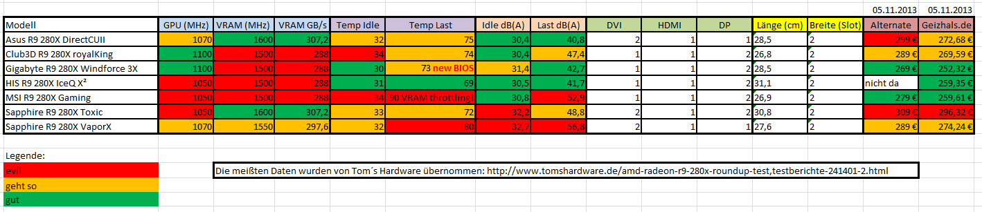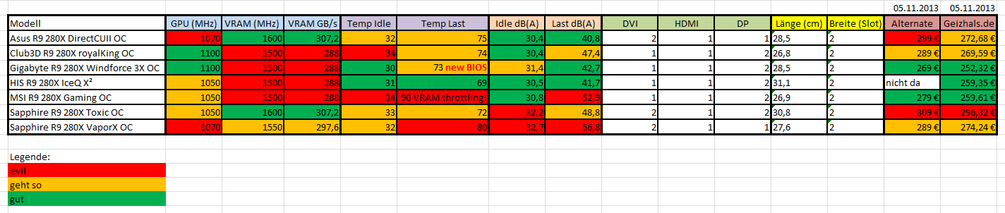 Sir_Sascha, übersichtliche tabelle, danke! laut geizhals hat die DirectCU II nur einen chiptakt von 850 MHz? kann das sein? eine OC hab ich nicht gefunden. gibt nur noch eine TOP und V2. derzeit ist in deiner tabelle 1070 bei der asus graka eingetragen und rot hinterlegt, während die karten mit 1050 gelb und mit "geht so" gekennzeichnet sind, während die mit 1100 grün hinterlegt sind. 1070 sind mehr als 1050 somit müsste die farbe umgedreht sein?