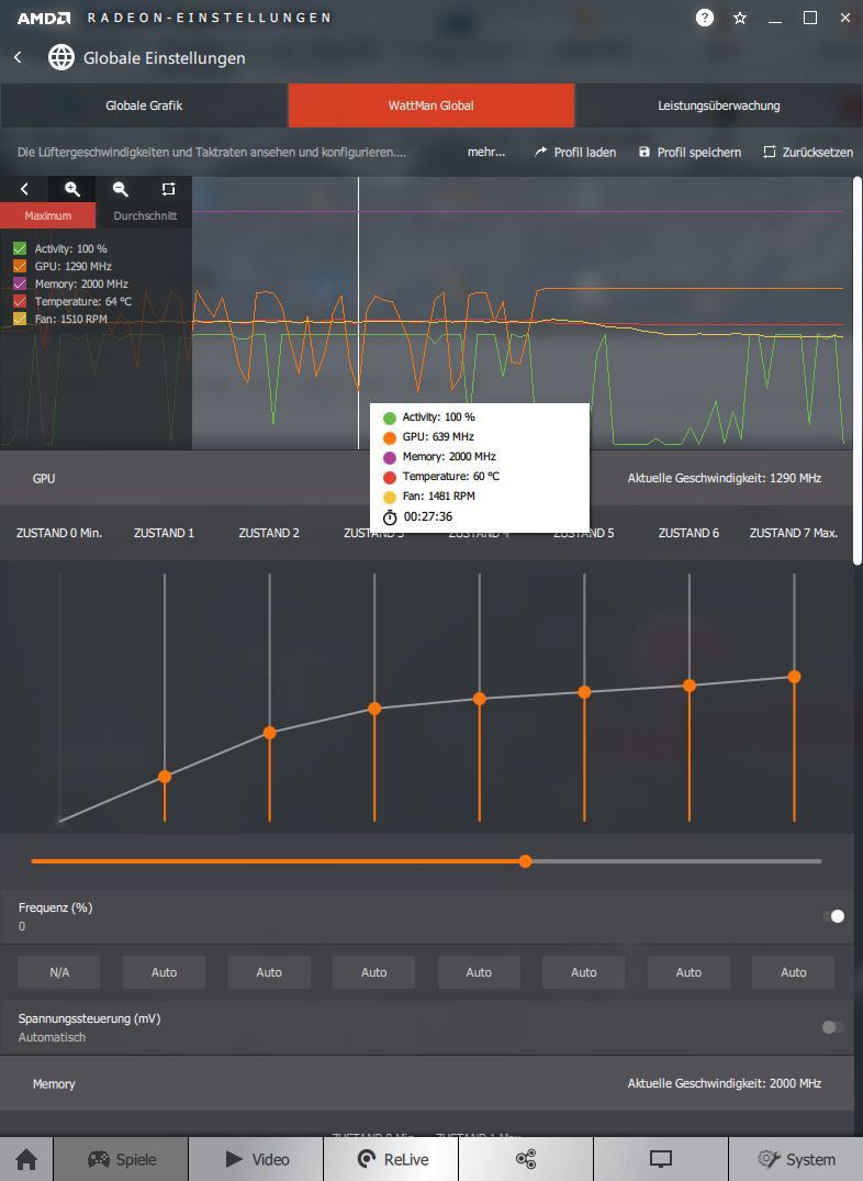 Ich suchte also weiter. Das Problem zeigte sich im MSI Afterburner Tool. Dort zeigte die Taktanzeige der GPU einen frequenten Drop von der normalen Frequenz hinunter und wieder nach oben. Normalfrequenz 1290MHz und der Abfall bis auf ca 700MHz. Der Taktabfall und Anstieg liegen innerhalb einer Sekunde. Im Radeon Tool WattMan zeigte sich das selbe Ergebnis. Siehe die Bilder im Anhang.