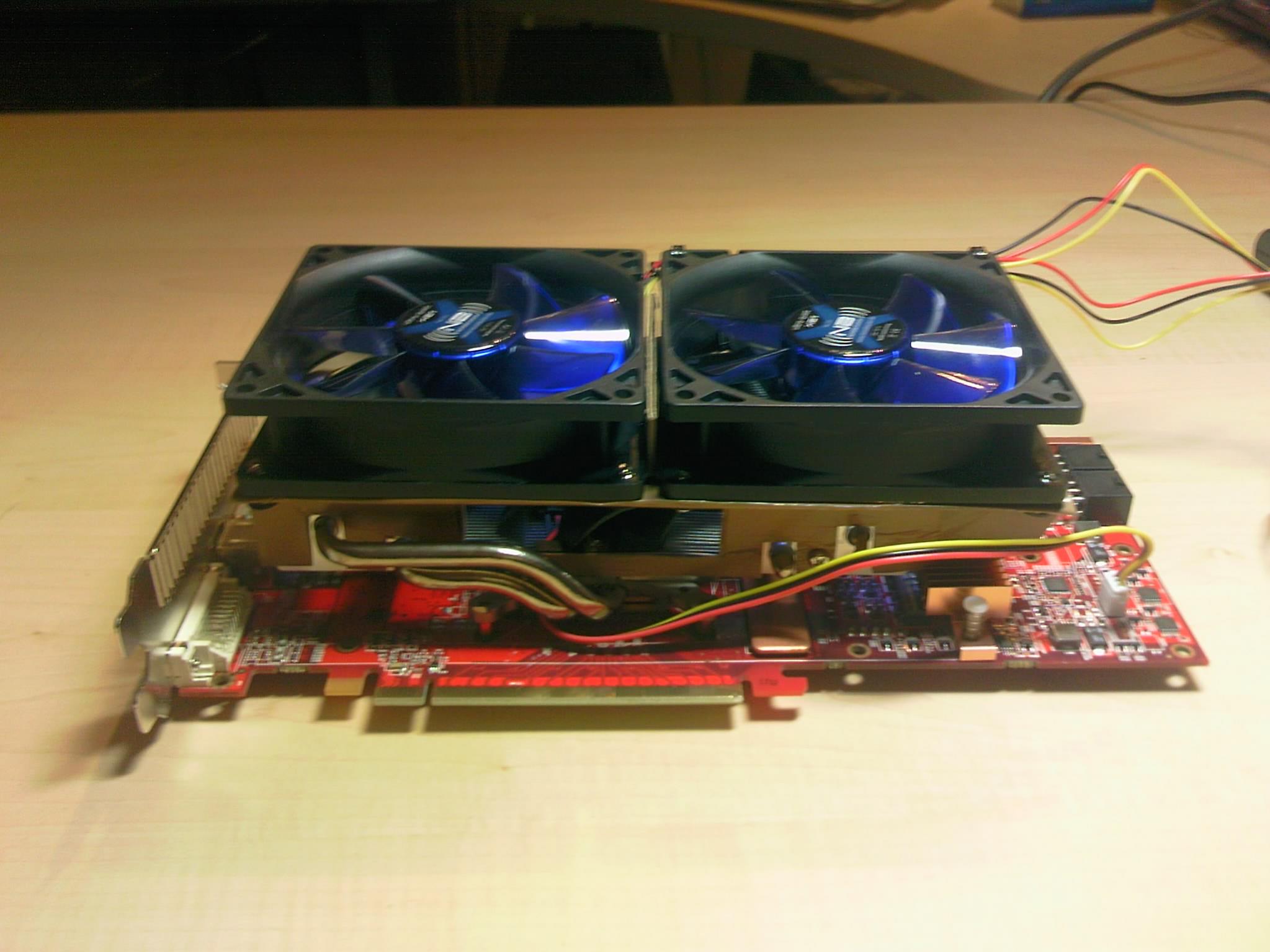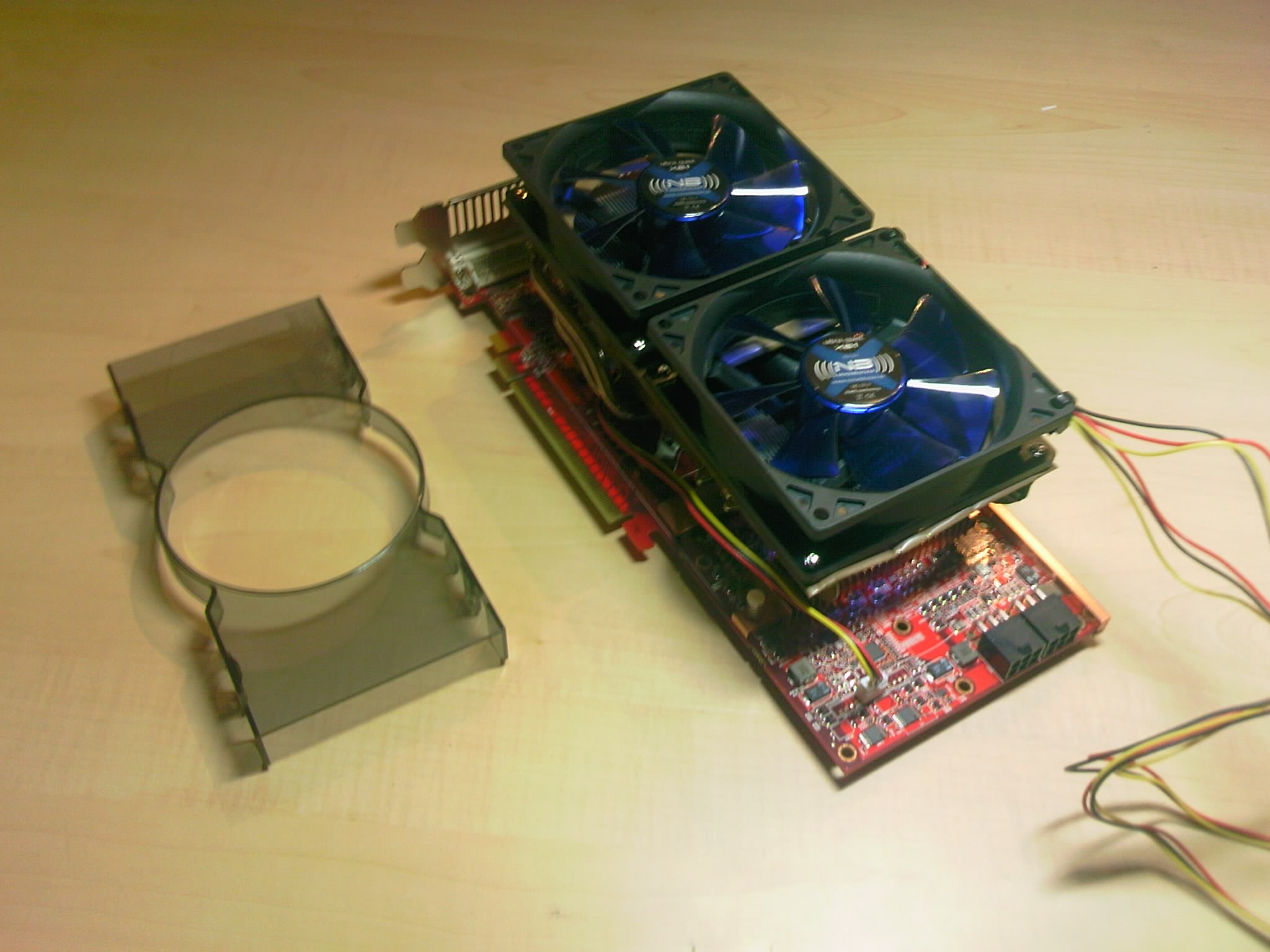 Also habe ich eine Modifikation für den Zerothermlüfter der Karten von Club3D (hab ich selbst im Einsatz) oder PowerColor entworfen. Dabei wird nur die Kunststoffabdeckung des Lüfters durch eine neue Halterung für zwei 92mm Lüfter ausgetauscht. Damit sollte einem Garantieaustausch der Karte nach Remontage der Kunststoffabdeckung nichts im Wege stehen.