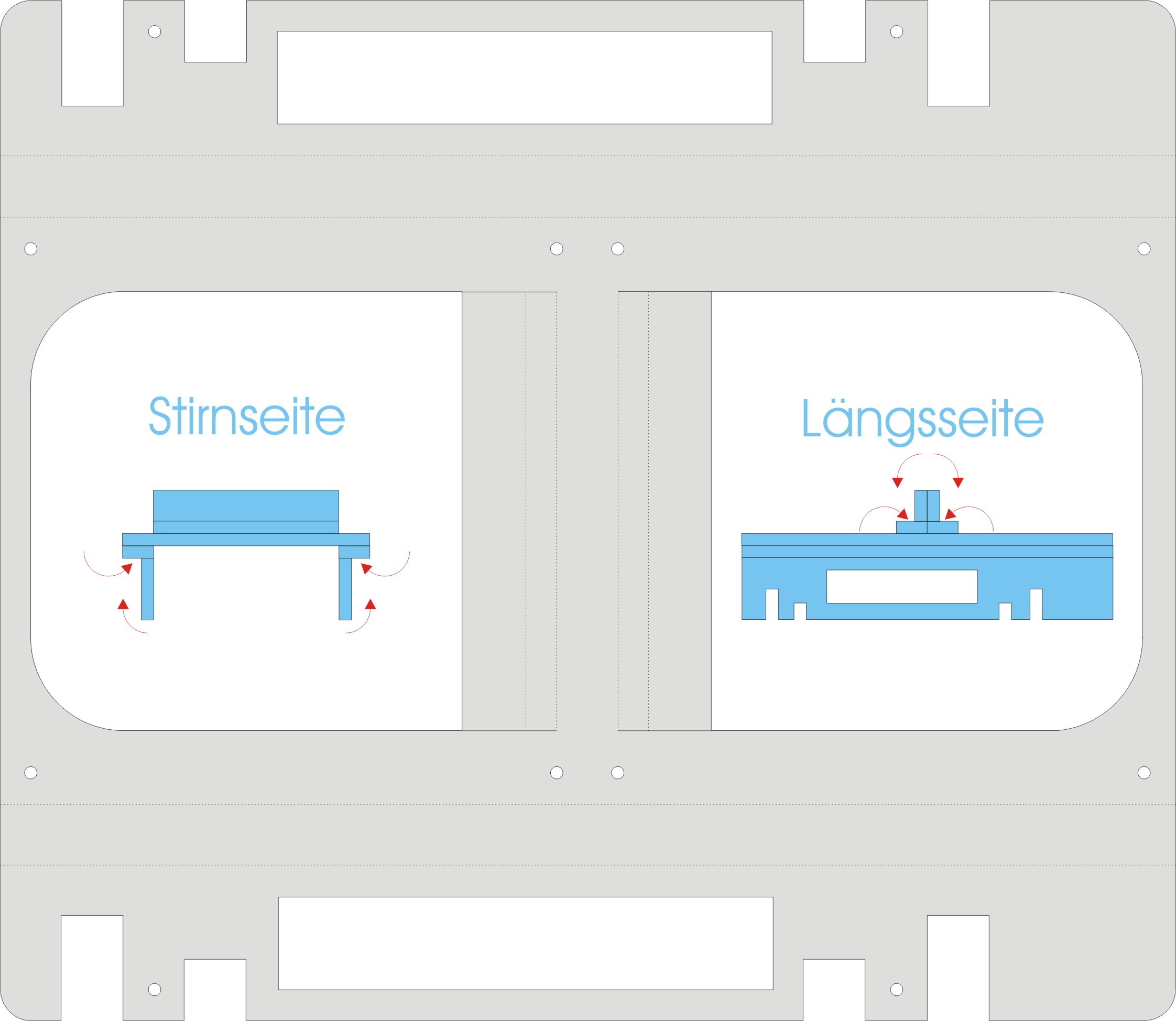 Die Lüfterhalterung kann leicht aus einem stabilen Kartonpapier gebastelt werden. Die Falzkanten sollten verklebt werden. Wer es stabiler mag, lässt sich von einem Schlosser mit einem Blech helfen. Dann kann man den Stabilisierungsfalz in der Mitte ggf. entfallen lassen. Hier die Schablone für die Lüfterhalterung.