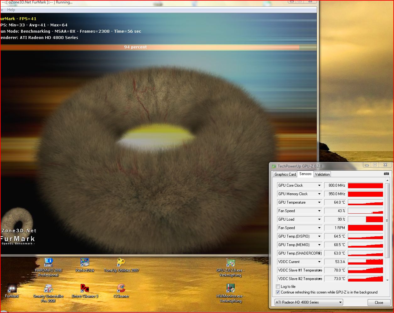 Ein lästiges Problem der Radeon 4870 Karten von Club3D oder PowerColor ist, dass der Lüfter bei einer Temperatur von 63°C kurz auf 100% dreht. Wenn dann die Temperatur wieder auf 50°C sinkt, schaltet sich der Lüfter wieder ab. Damit dreht der Lüfter im schlichten 2D-Idle-Betrieb alle 30sek störend hoch.