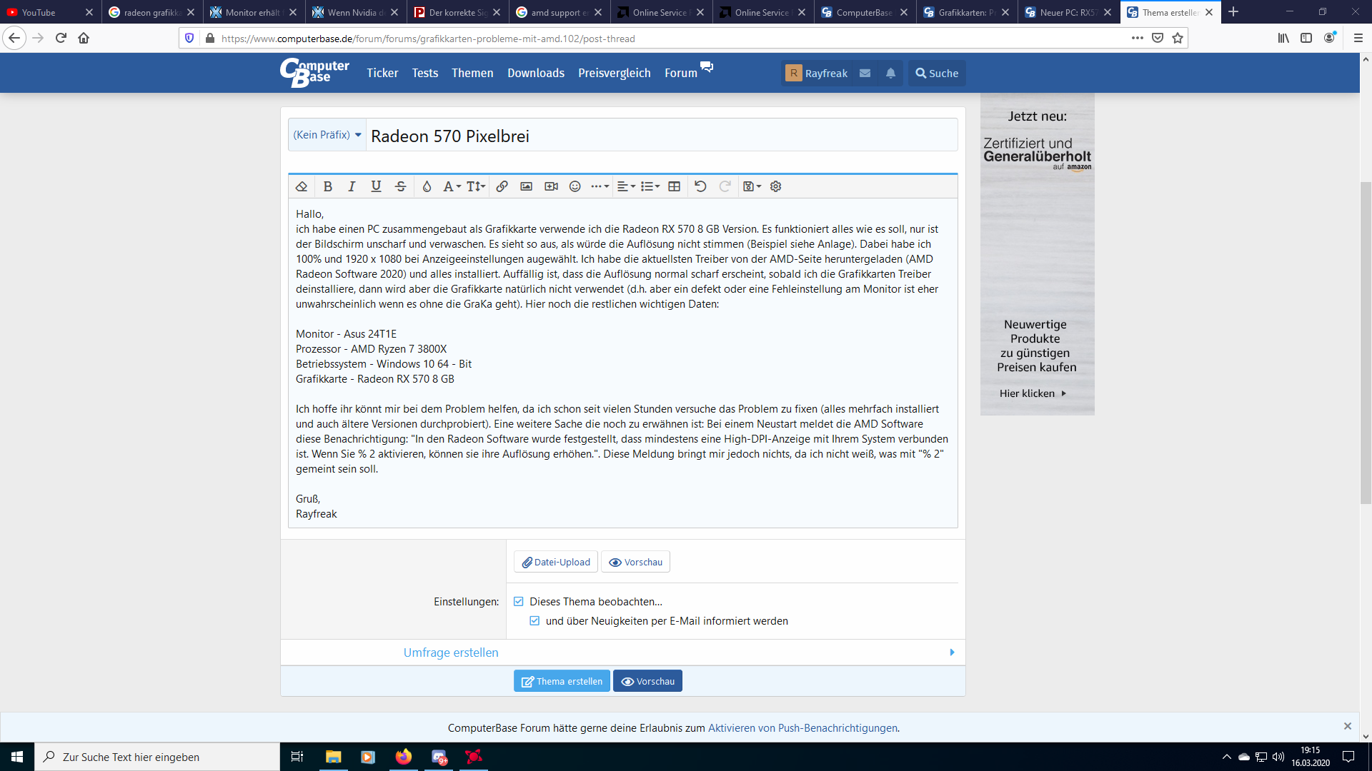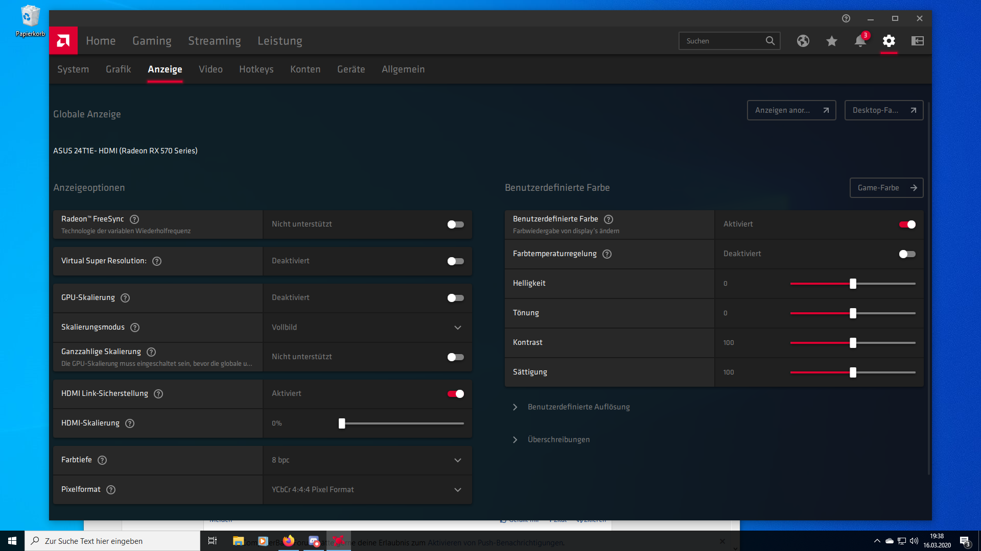 ich habe einen PC zusammengebaut als Grafikkarte verwende ich die Radeon RX 570 8 GB Version. Es funktioniert alles wie es soll, nur ist der Bildschirm unscharf und verwaschen. Es sieht so aus, als würde die Auflösung nicht stimmen (Beispiel siehe Anlage). Dabei habe ich 100% und 1920 x 1080 bei Anzeigeeinstellungen augewählt. Ich habe die aktuellsten Treiber von der AMD-Seite heruntergeladen (AMD Radeon Software 2020) und alles installiert. Auffällig ist, dass die Auflösung normal scharf erscheint, sobald ich die Grafikkarten Treiber deinstalliere, dann wird aber die Grafikkarte natürlich nicht verwendet (d.h. aber ein defekt oder eine Fehleinstellung am Monitor ist eher unwahrscheinlich wenn es ohne die GraKa geht). Hier noch die restlichen wichtigen Daten:
