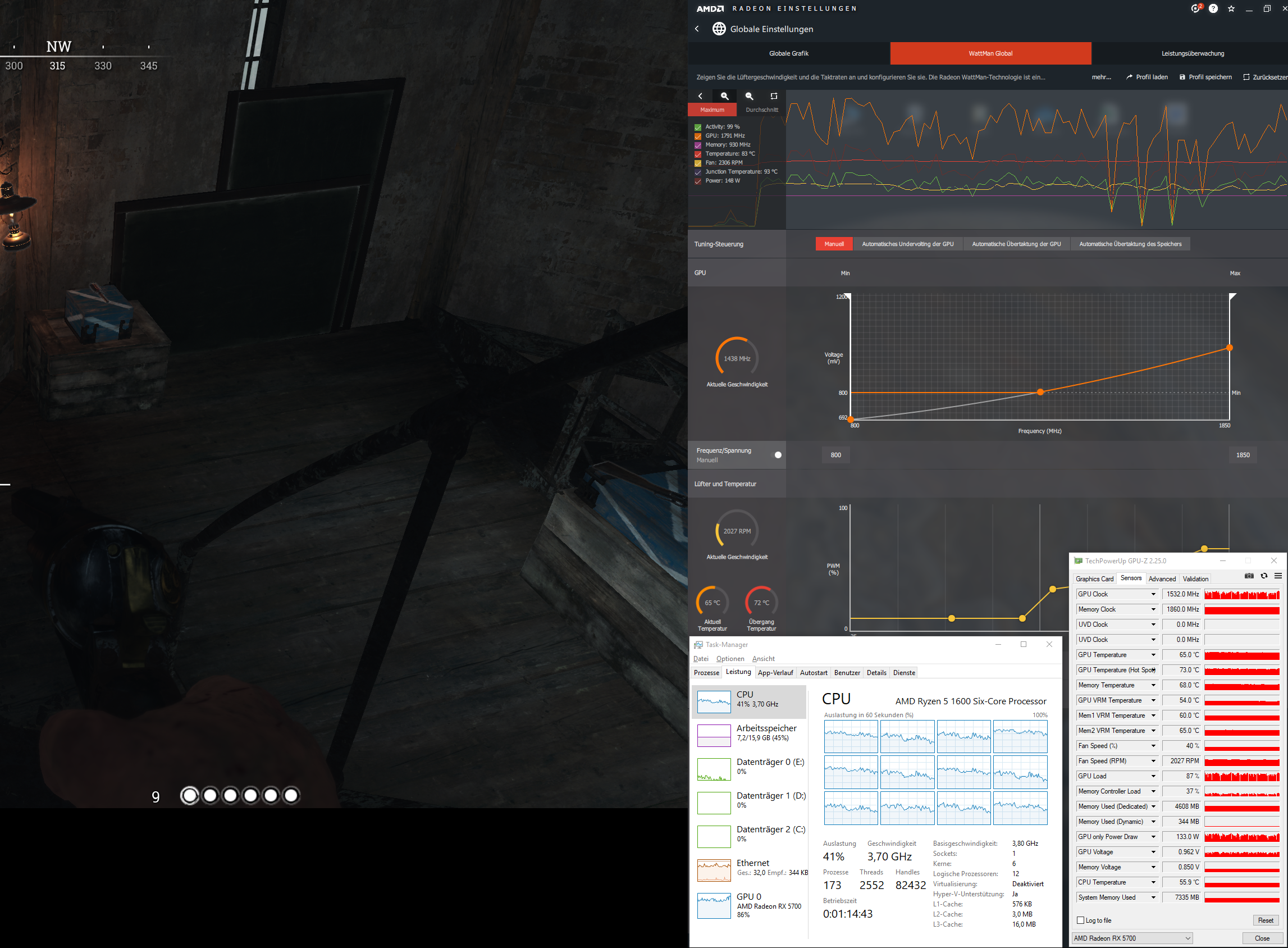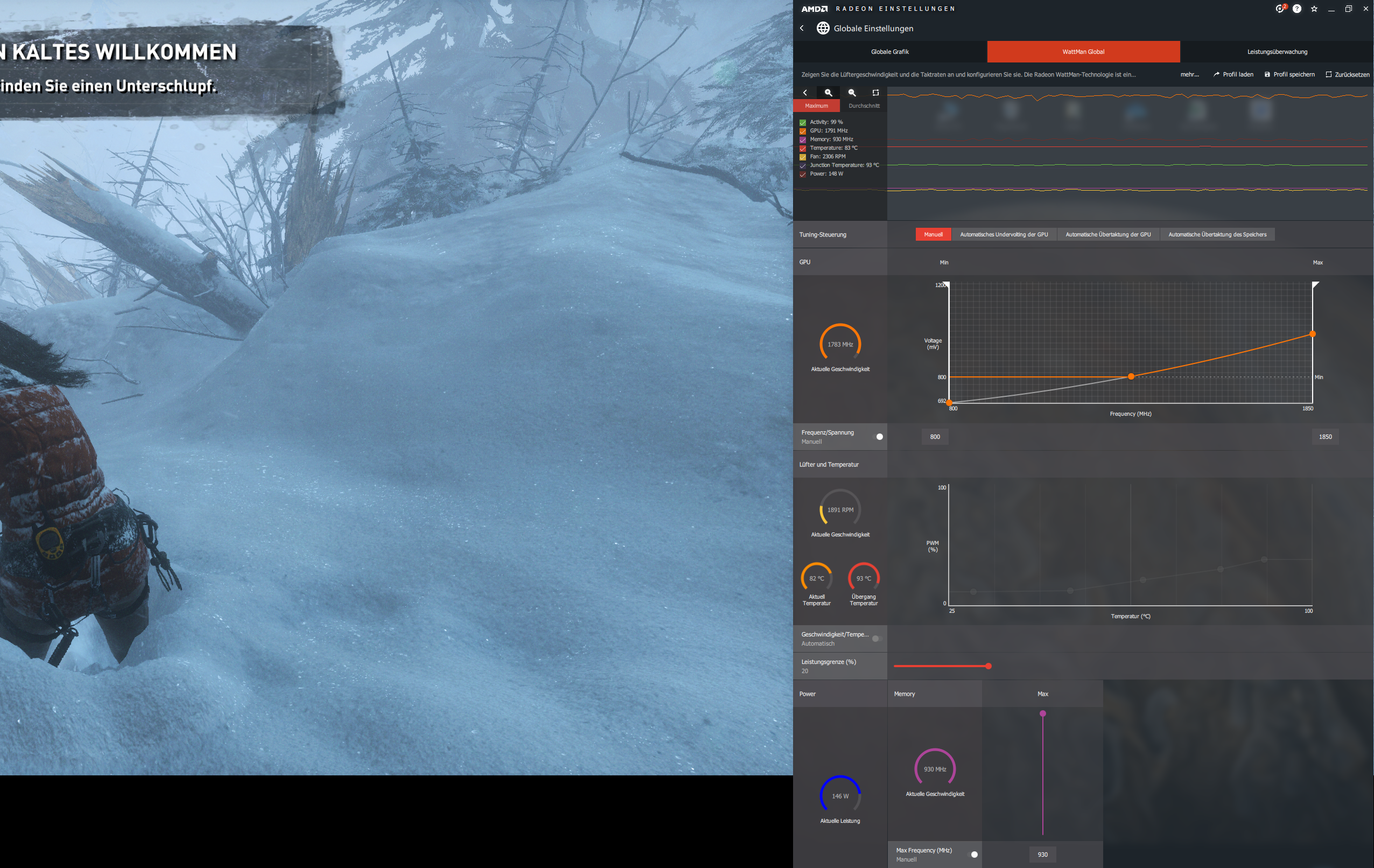Die Karte taktet sich ohne ersichtlichen Grund runter manchmal bis auf 10 MHz. Dies führt natürlich zu ruckeln in der nächsten Sekunde läuft dann wieder alles normal. Ich habe in Tomb Raider einen stresstest gemacht (2 Stunden laufen lassen mit der Standard Lüfterkurve). Die karte hat sich kein einziges Mal runter getaktet. Dann hab ich das mit Hunt Probiert mit einer aggressiveren Lüfter kurve um die Temperatur auszuschließen (sehe Screenshots) mit der RX 480 lief das Spiel ohne diese Ruckler.