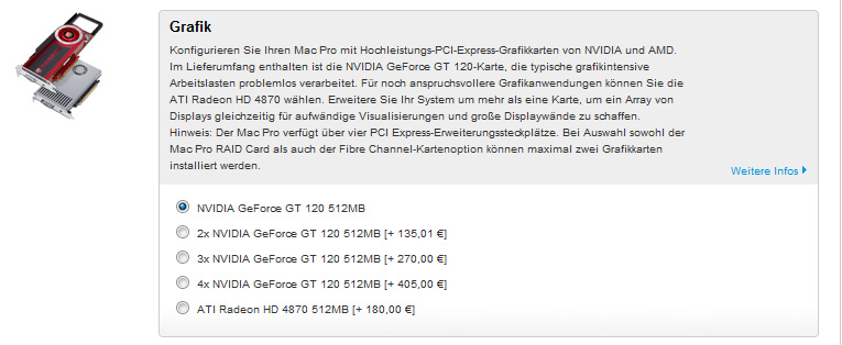Aber das ist doch vollkommen falsch gerechnet. Apple möchte für die zweite gt 120 einen Aufpreis von 135€, oder 180€ für eine 4870. Somit wäre dann der Preis von der ATI nur 45€ mehr! Und nicht 180€ mehr.