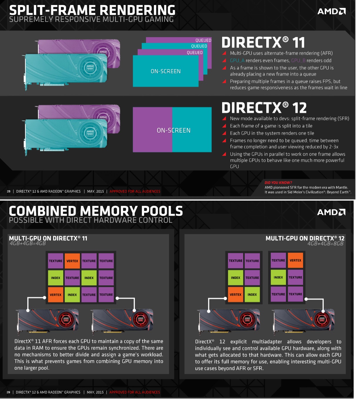 Naja, WENN denn ein Entwickler DX12 SFR integriert und WENN dann in einem Spiel eine glatte 50/50 Arbeitsteilung zwischen 2 Karten möglich ist ja dann, aber auch nur dann hat man theoretisch den doppelten VRAM zur Verfügung. In der Praxis wird das aber wohl eher nicht passieren und der verfügbare VRAM wird von Anwendung zu Anwendung bzw. sogar innerhalb einer Anwendung Schwankungen unterliegen.