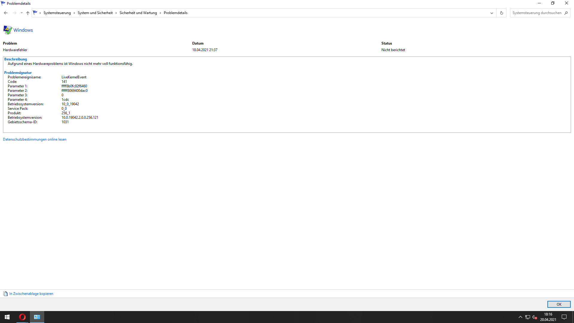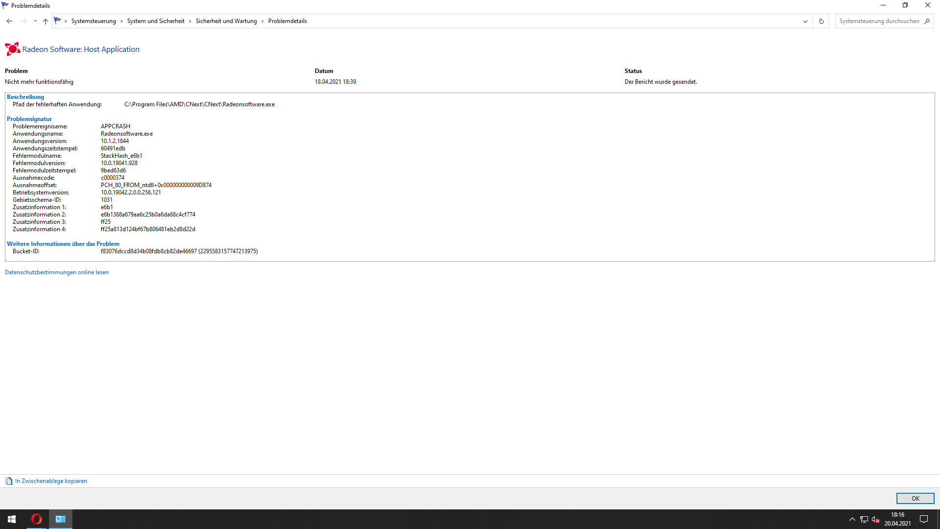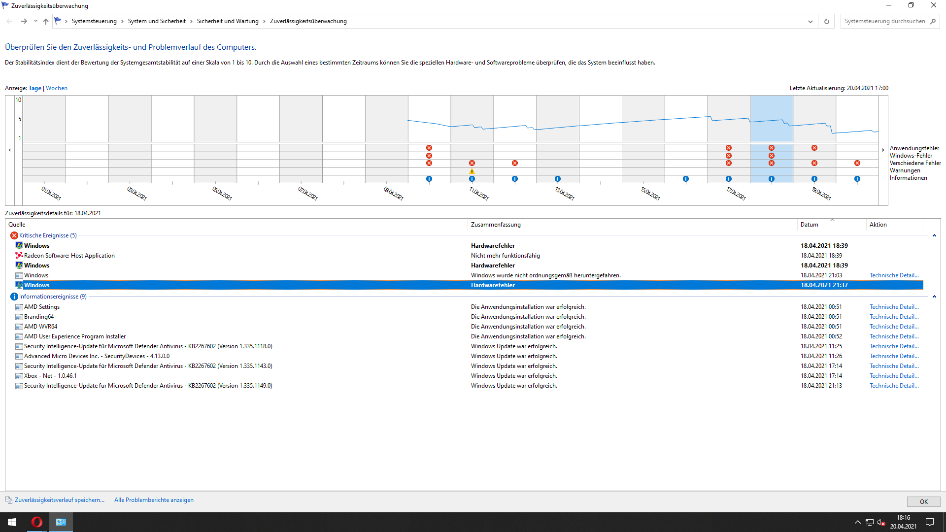 Der Zuverlässigkeitsverlauf gibt die unten angegebenen Fehlercodes. Häufig sagt er aber nur das Windows nicht ordnungsgemäß runtergefahren wurde. Ich habe kein OC betrieben und die Einstellungen in Adrenalin auf Standard gelassen. Der automatische Neustart ist Deaktiviert.