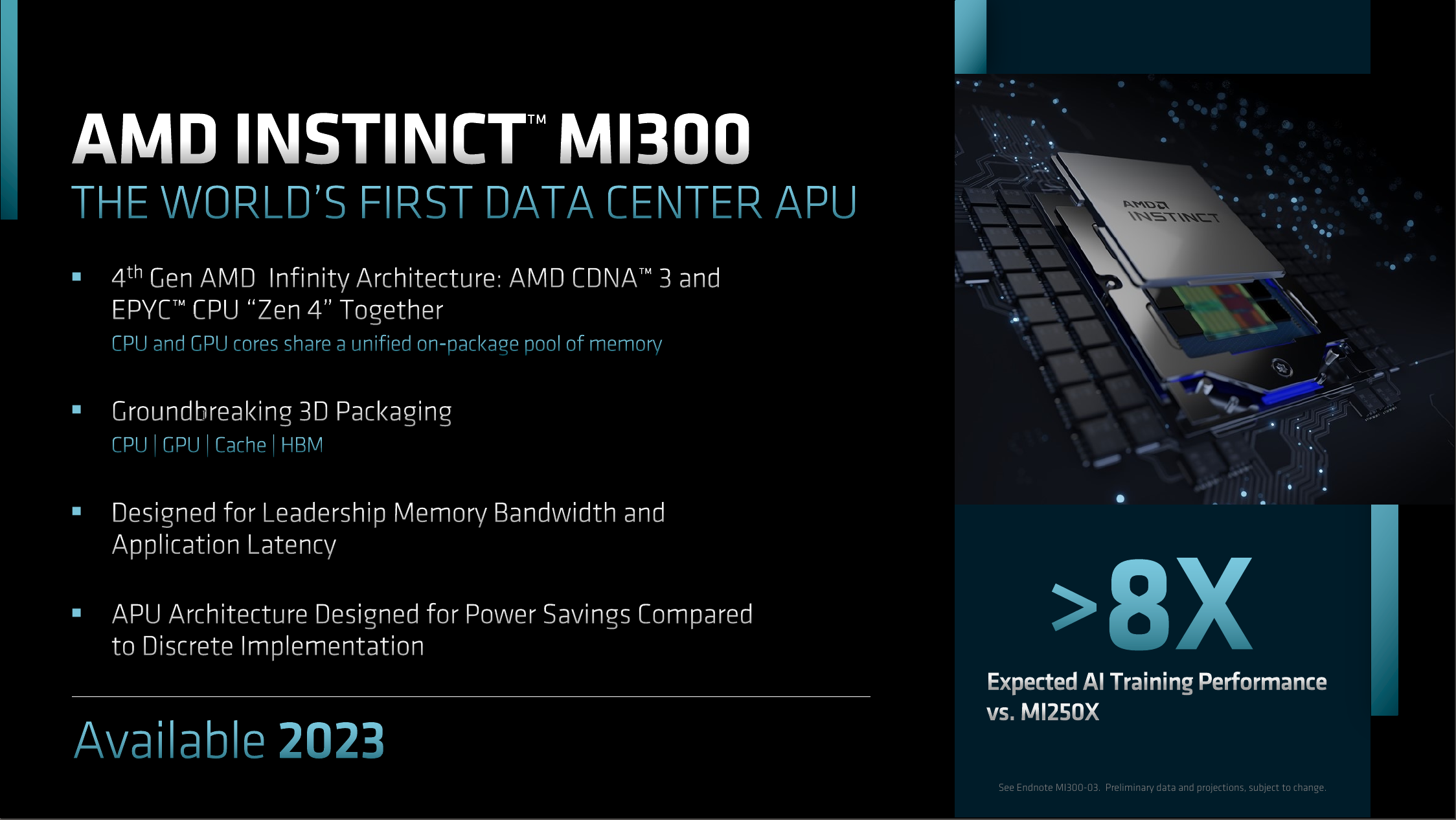 Artikel-Update: Die Meldung wurde um die Information, dass die Zen-4-CDNA-3-APU „MI300“ als sockelbares Package noch bis Ende 2023 erscheinen soll, ergänzt. Ob es wie bisher bei CDNA 2 auch PCIe-Varianten und reine GPU-Varianten geben wird, blieb offen.