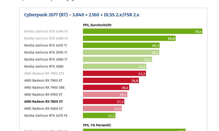 Beim Messwert für "Cyberpunk 2077 (RT) – 3.840 × 2.160 + DLSS 2.x/FSR 2.x" scheint sich ein Fehler eingeschlichen zu haben. Oder wie kommt dieser niedrige Wert der 4070 zustande?