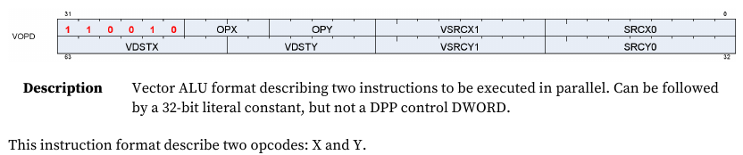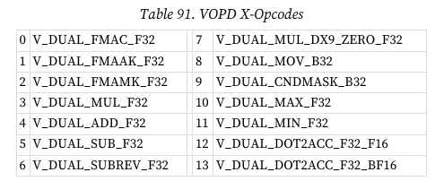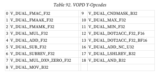 Dual Issue wird mit dem Vektor ALU Format VOPD angesprochen. Es ist eines von 9 verfügbaren Vektor ALU Formate. Es wird In Abschnitt 15.3.7 "VOPD" auf Seite 168 beschrieben