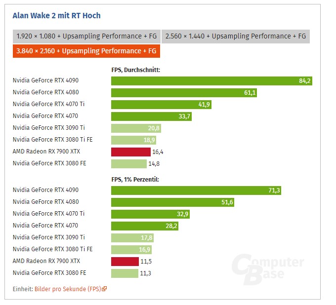 Auf dem Screenshot ist auf den NVIDIA-Karten FG aktiviert und auf den AMD-Karten nicht. Und eine für eine sinnvolle FG-Nutzung ausreichende Grund-Framerate wird in diesem Fall nur durch die 4090 erreicht (42 FPS => 84 FPS). Die NV-Karten sind in Pathtracing natürlich trotzdem wesentlich schneller (bei jeweils gleichem Preispunkt), allerdings ist das Bild das dieser Screenshot vermittelt nicht realistisch.MrHeisenberg schrieb:Sag das den Usern mit AMD Karte, die sich auf AW2 mit PT gefreut haben: