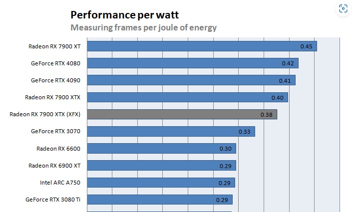 AMD hat die Effizienz (W/FPS) in Spielen gegenüber RDNA2 deutlich verbessert. Sieh dir bitte auch das Effizienz-Ranking bei Igorslab an, das sieht gut aus für AMD. Nvidia hat aber nochmal einen besseren Job gemacht. Jetzt muss man an der Stelle aber wieder sagen, dass dies nur eine Momentaufnahme ist, wegen "Fine Wine" und so. Da werden sich die Ergebnisse mit der Zeit für AMD noch weiter verbessern. Und man sollte auch nicht vergessen, dass Nvidia einen effizienteren monolithischen Aufbau hat und mit N4 noch einmal einen etwas besseren Herstellungsprozess.