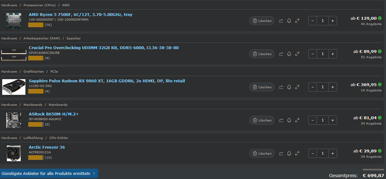 Oder den für 250€ incl. Versand erst einen Ryzen 7 5700X3D bestellen und dann mit den restlichen 400€ sowas wie eine Radeon RX 7700 XT bestellen?