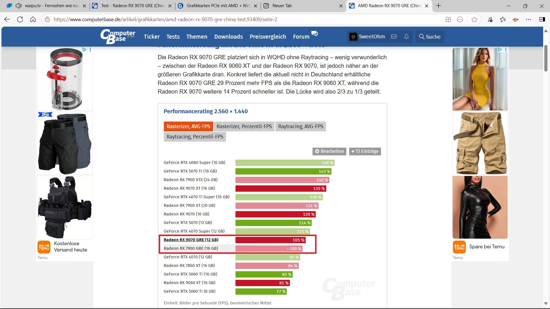 Diesbzgl. zeigt sich dort insgesamt weniger Leistung als beim GRE Vorgänger, wohl auch wegen des 12 GB kleinen Speichers, und in Zukunft dürfte eher für die 16GB (7900GRE) als 12GB (9070 GRE) Grafikkarte besser altern.