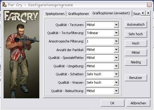 also ich zogge FarCry mit meinem Aktuellen System (Siehe Signatur) mit diesen Einstellungen + 2*FSAA & 4*AF @ 1024*768*32