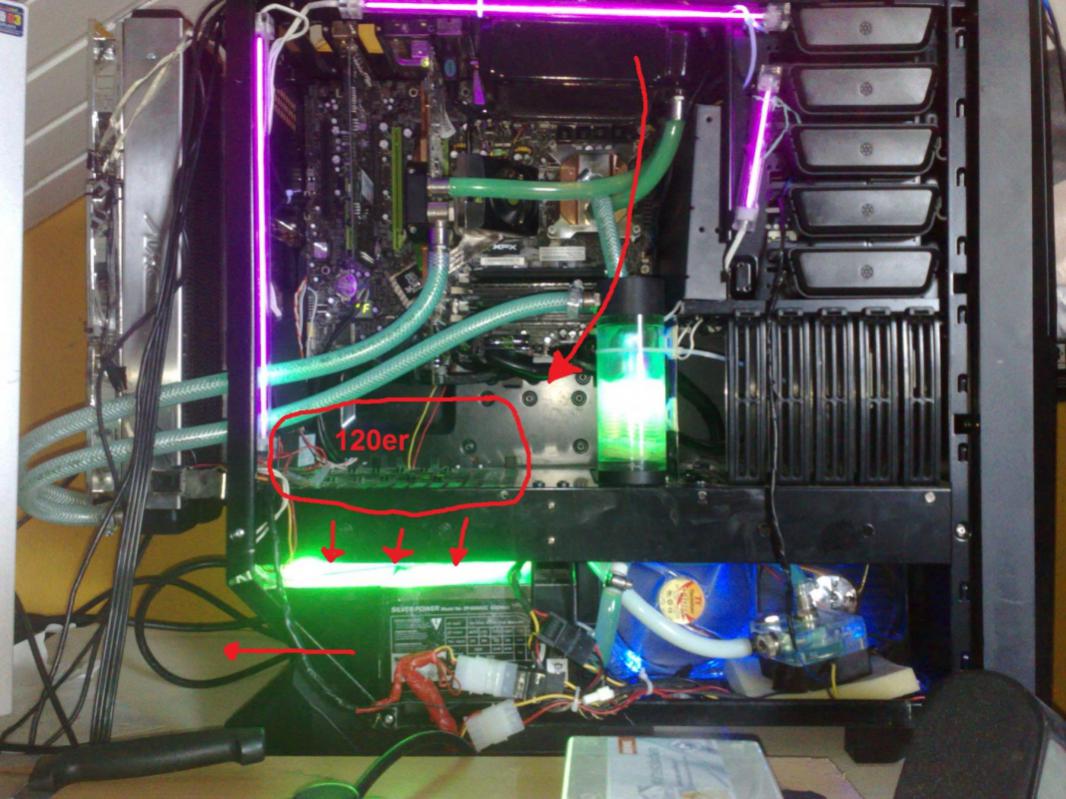 so nun ist mir wie schon gesagt, wenn ich spiele ist mein 120iger Radi am Decke sehr warm wobei meine Anderen 2 nicht mal Handwarm sind und der 120iger doch echt richtig Warm würde mal auf ca. 30c schätzen.