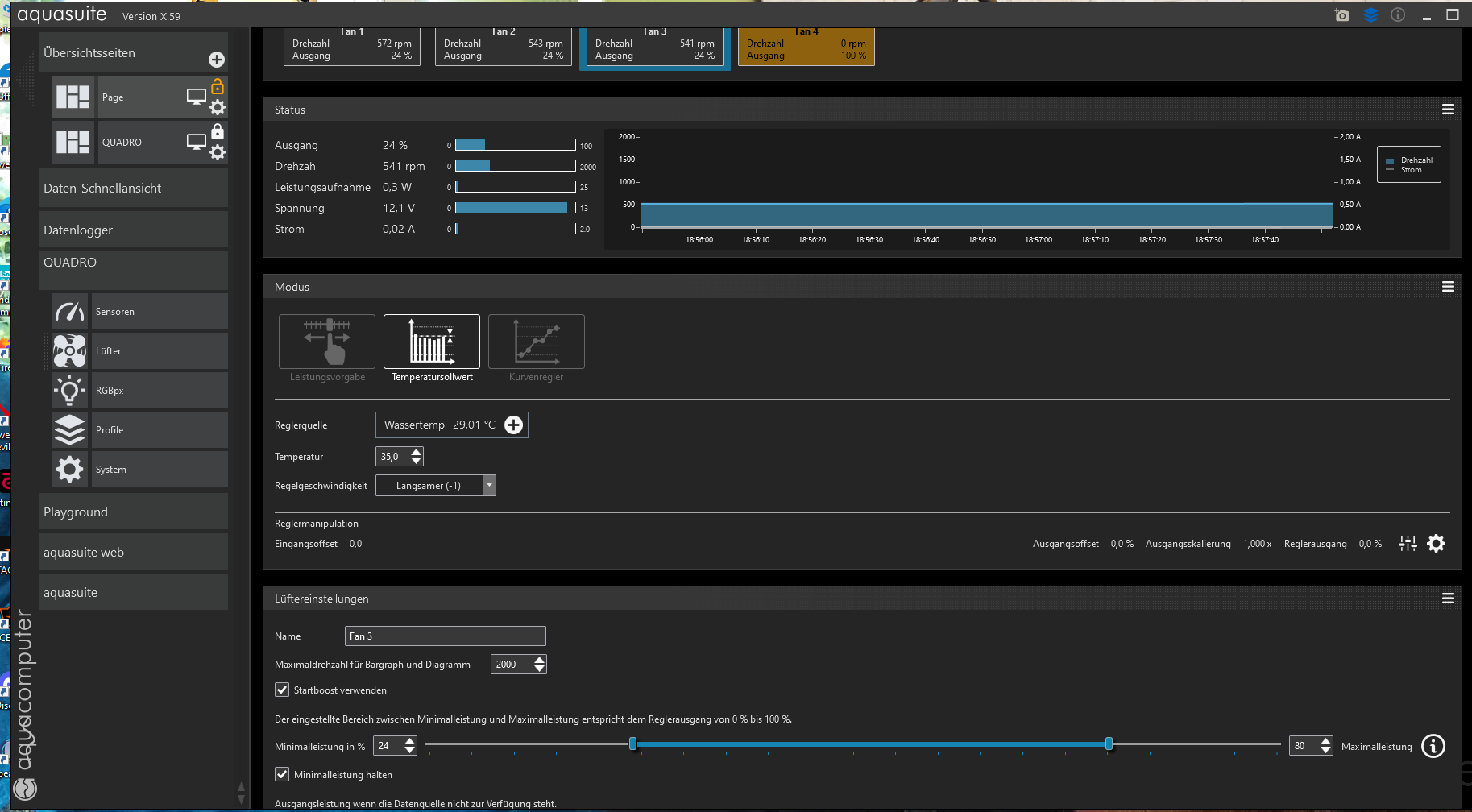 Habe in der Quadro Steuerung jetzt erstmal alle fans auf 600upm gestellt, werde die tage das noch alles genauer einstellen.. Meine Wassertemperatur befindet ist während ich das hier schreibe bei 29 grad. Wenn ich Valley Benchmark und den stress test von cpuZ gleichzeitig laufen lasse, geht die hoch auf 35 grad. Werde die tage das noch alles genauer mit den Lueftern einstellen.