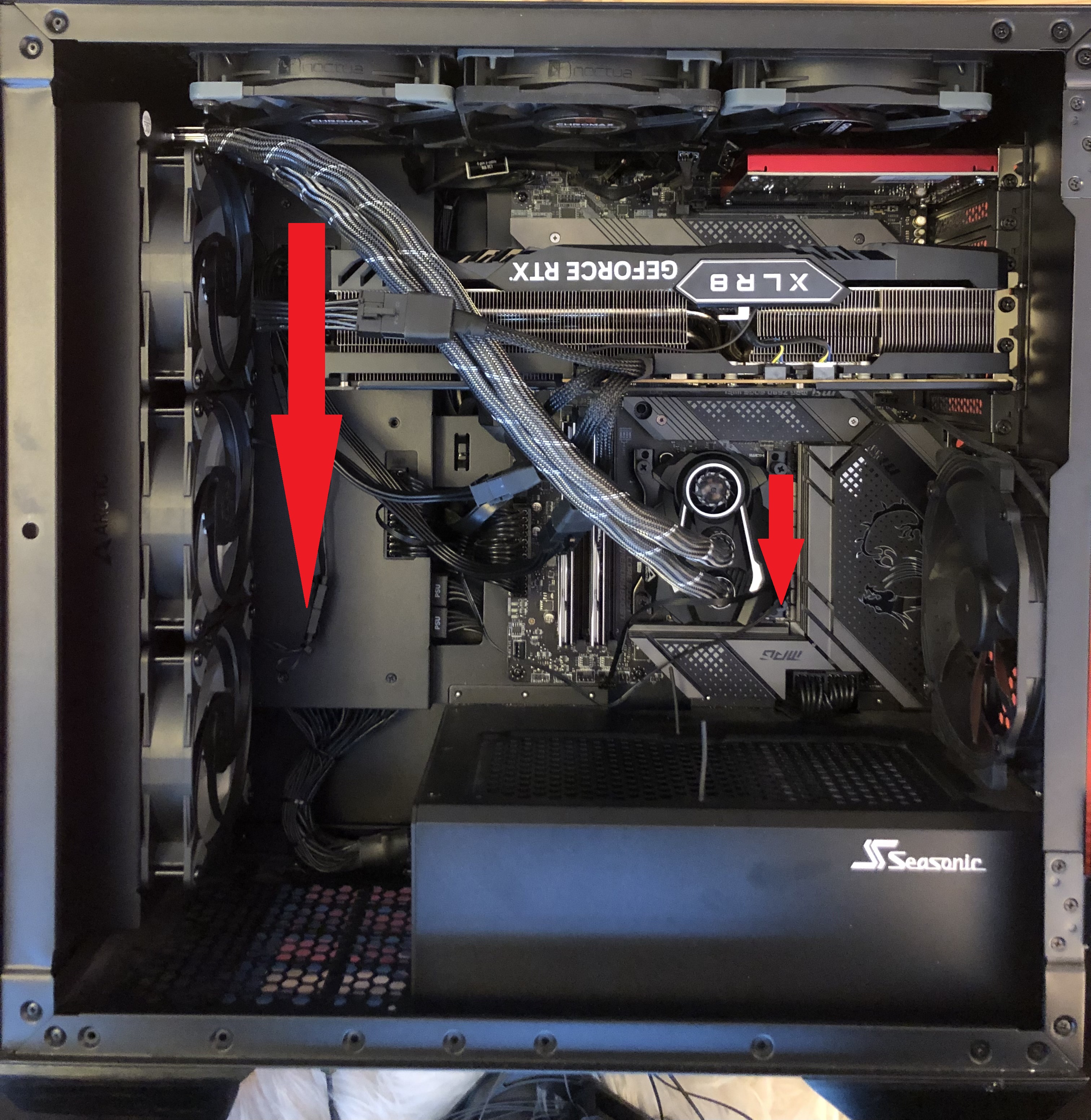 ich wurde von einem Communitymitglied soeben darauf hingewiesen, dass ich meinen Radiator falsch montiert habe. Dieser ist frontal montiert und der Schlauch führt herunter zur Pumpe, nun soll aber der Schlauch wohl nach oben gehen. Da ich das Seasonic Case Syncro Q 704 besitze, in dem u.a. die GPU auf dem Kopf installiert wird, frage ich mich, ob ich den VRM Lüfter auch falsch installiert habe? Eigentlich dachte ich, dass ich mich an die Arctic-Anleitung gehalten habe. Bin jetzt wirklich wirr und wäre euch dankbar, wenn ihr mir mitteilen könntet, ob bei