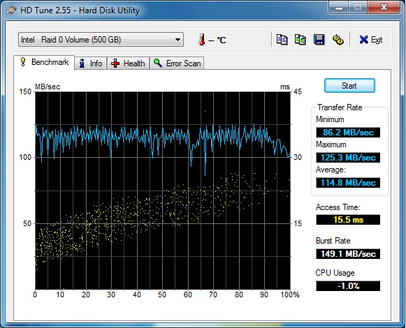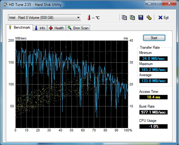 Ich besitze zwei Seagate Baracuda Barracuda 7200.10 SATA 3.0Gb/s 250-GB, die im einzelbetrieb laut HD Tune schon ca. maximal 100 MB/s schaffen. Im RAID 0 liefern aber beide zusammen nur ca. 125 MB/s maximal.