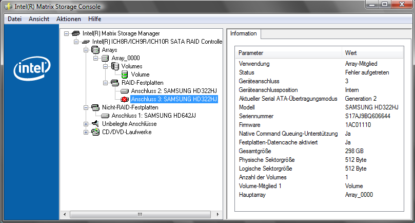 Fogendes: Ich betreibe seit etwa einem Jahr ein raid 0 aus zwei Samsung Spinpoint F1 320gb Platten. Außerdem habe ich noch eine F1 mit 640gb als backup. Seit etwa einer Woche meldet mir der Intel Teiber eine Fehlermeldeung. Ich habe daruafhin natürlich gleich alle Daten gesichert, was auch geklappt hat. Der Rechner läuft nach wie vor mit der Einschränkung der Auflösung bei 1024x768, was äußerst beschränkend ist... (wie kann ich das umgehen?)
