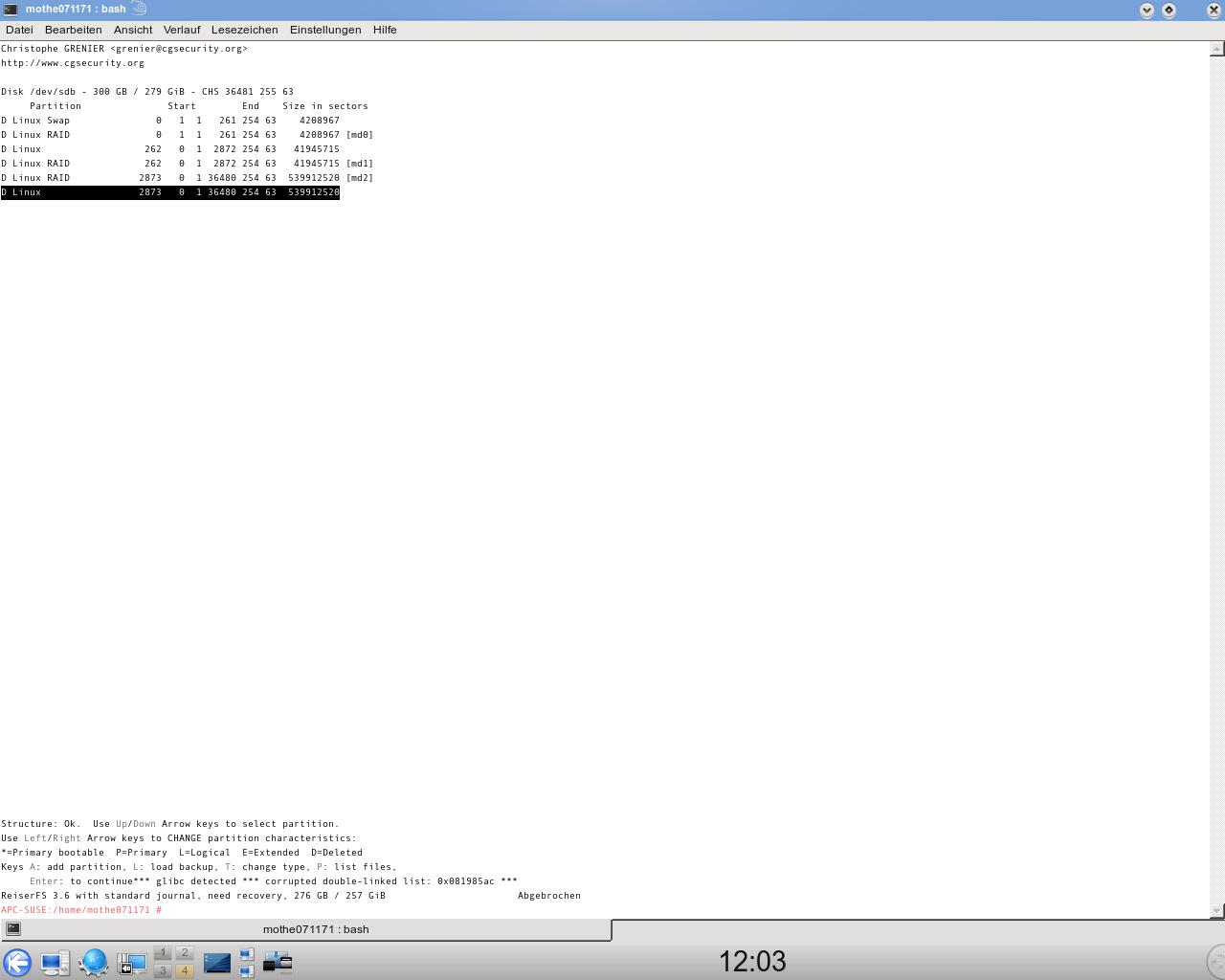 1. Beim Versuch, unter Testdisk die Files in einer Partition anzeigen zu lassen, erhalte ich eine Fehlermeldung (sinngemäß: "glibc found, double index") und das Programm bricht ab.