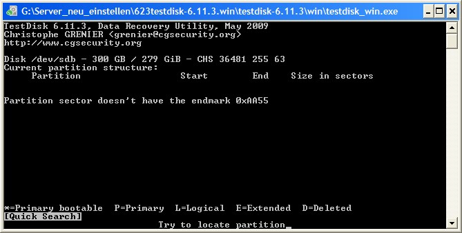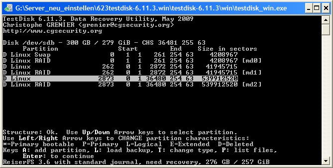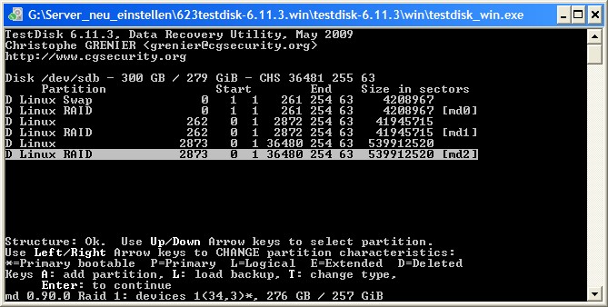 2. Testdisk zeigt alle drei Partitionen an, und zwar einmal "normal" und einmal als "RAID". Ich vermute, das liegt daran, dass die Platte Teil eines MIRROR war. Außerdem erscheint eine Fehlermeldung, dass dem partition sector die Endmarke fehlt (das schreibe ich mal dem Skript des Herstellers zu).