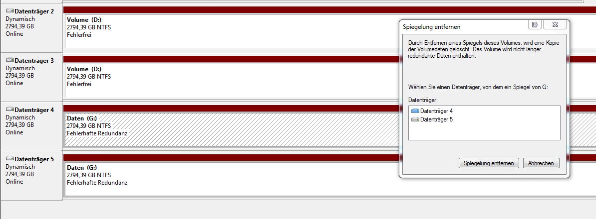 Ich hatte eine Softwareraid 1 (erstellt in Win 7) laufen und vor 2 Tagen ist tatsächlich eine der Platten kaputt gegangen. Die andere funktioniert aber noch. Die Daten wurden gesichert und ich will das Raid 1 auflösen, um die defekte Platte einschicken zu können.