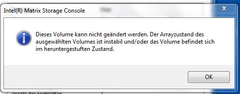 Wenn ich einen Rechtsklick auf besagtes Volumen mache (Volumen bearbeiten) kommt die Meldung "Dieses Volumen kann nicht geändert werden. Der Arrayzustand des ausgewählten Volumes ist instabil und/oder das Volume befindet sich im heruntergestuften Zustand". (siehe Bild)