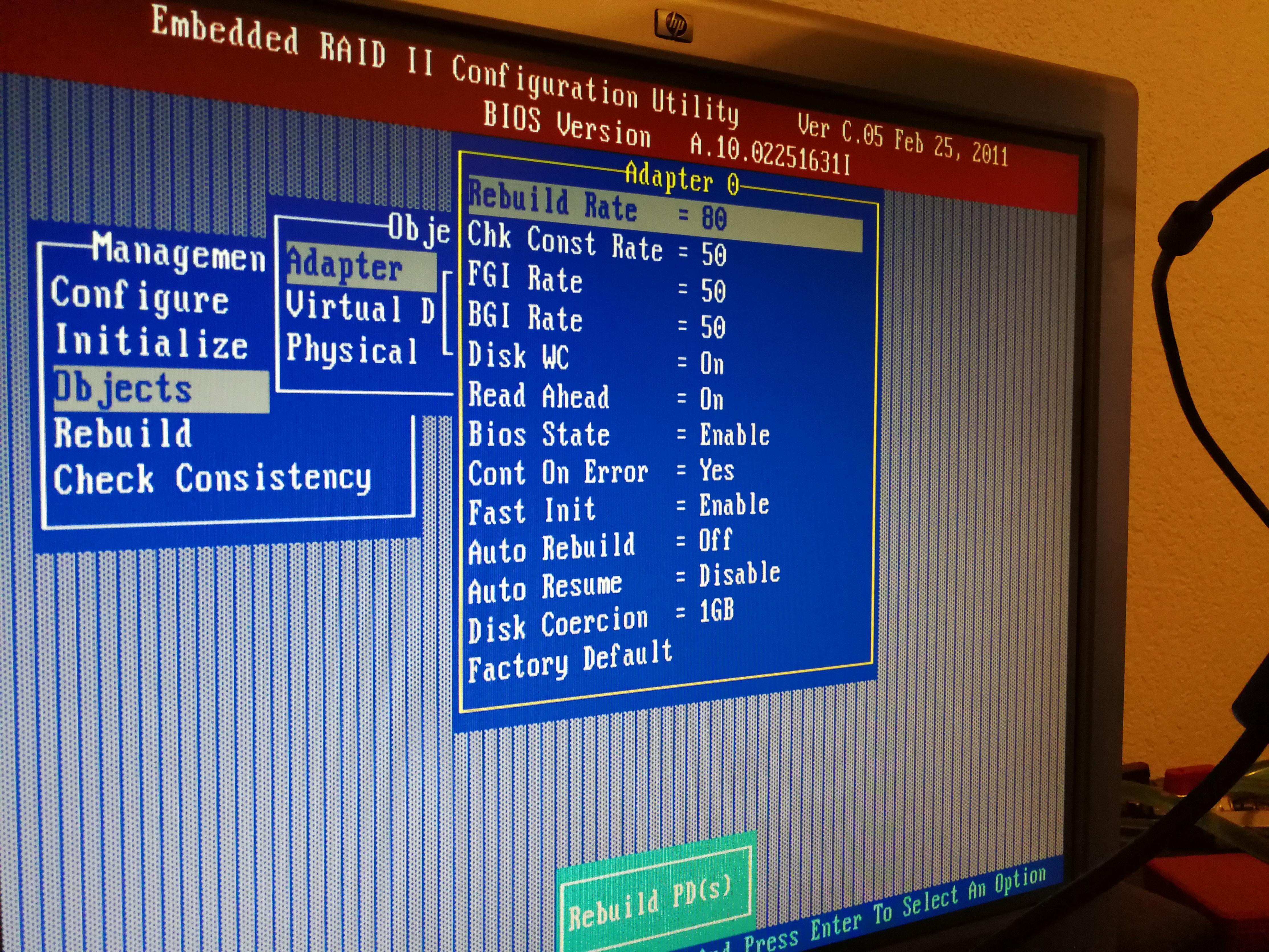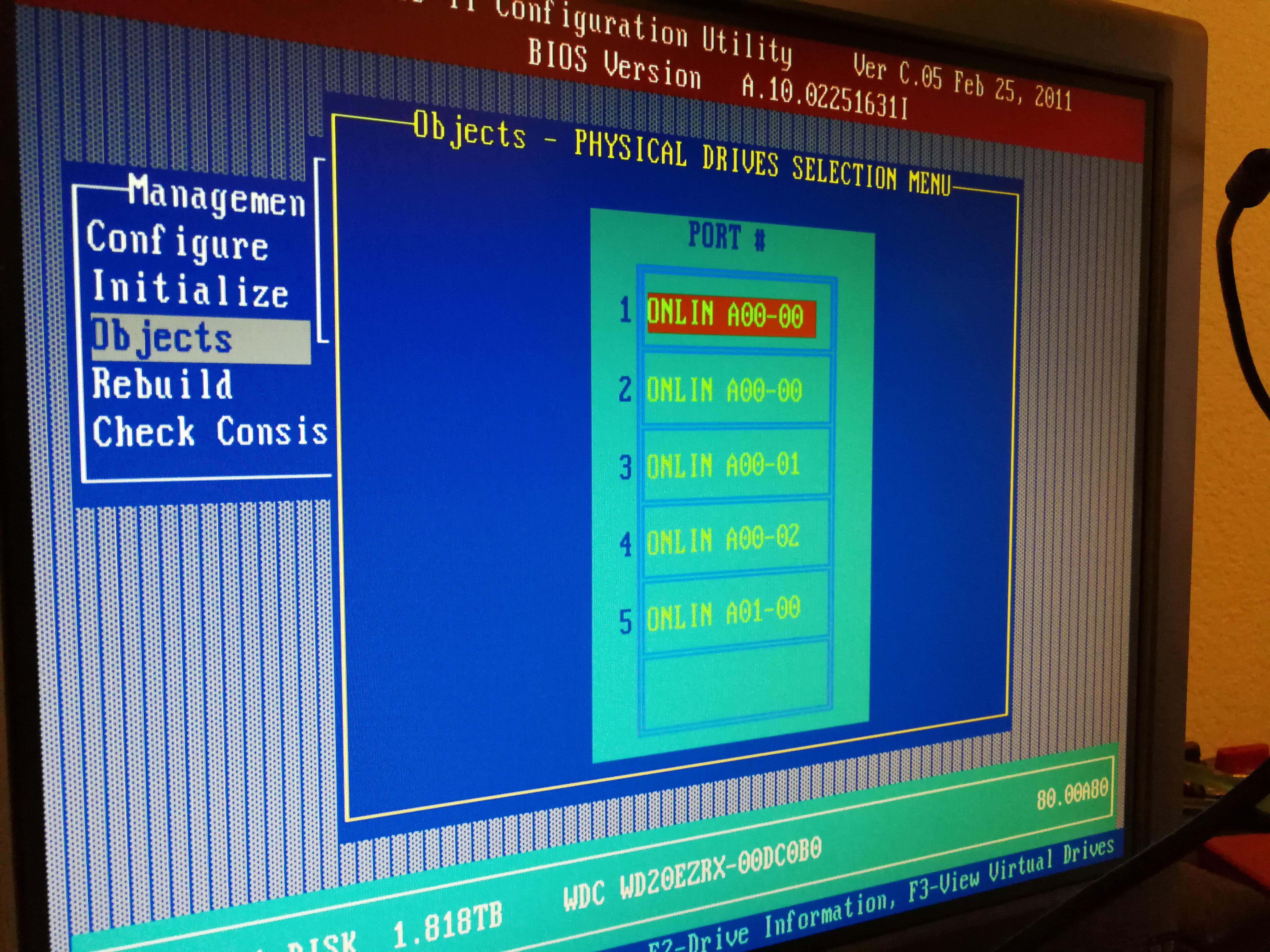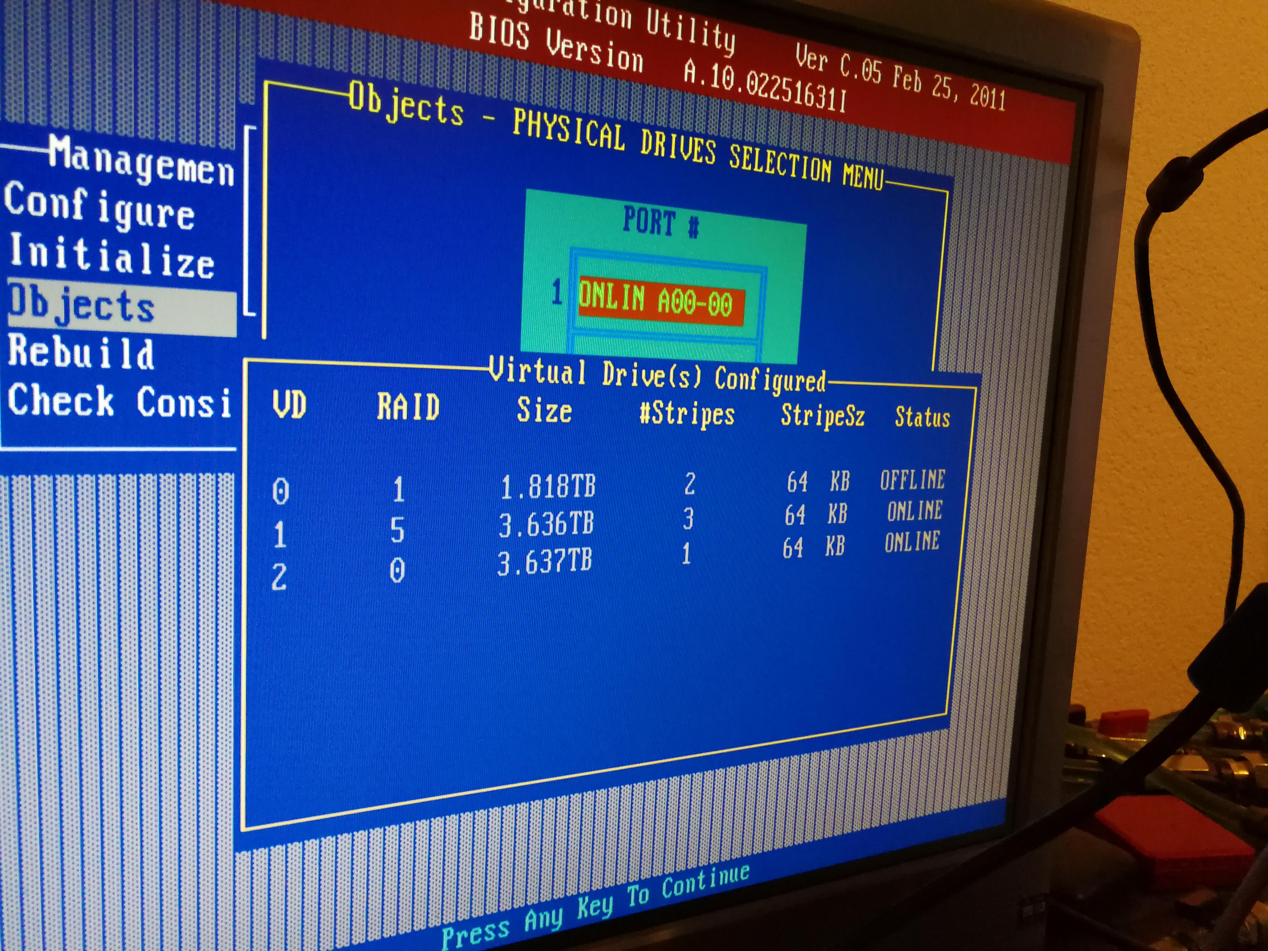 Es hat zudem noch ein RAID 5 Verbund (3 Platten) und ein RAID 0, wobei da nur eine Platte dran ist, ging aber nicht anders um den Steckplatz zu nutzen...