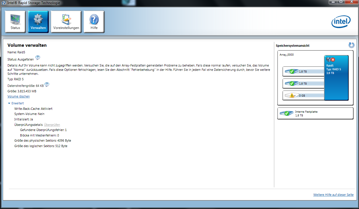 Als ich das System wieder neu starten wollte, kam das Unheil. Im Intel-Raid-Bios wurde die erste Festplatte als eine "member disk" die zweite "none raid disk" die dritte "member disk" angezeigt. Jetzt wird das Raid als fehlerhaft bezeichnet und es kann nicht mehr darauf zugegriffen werden.