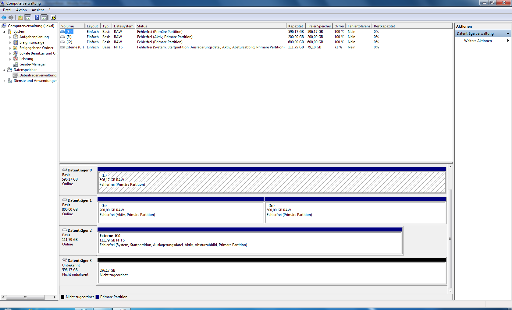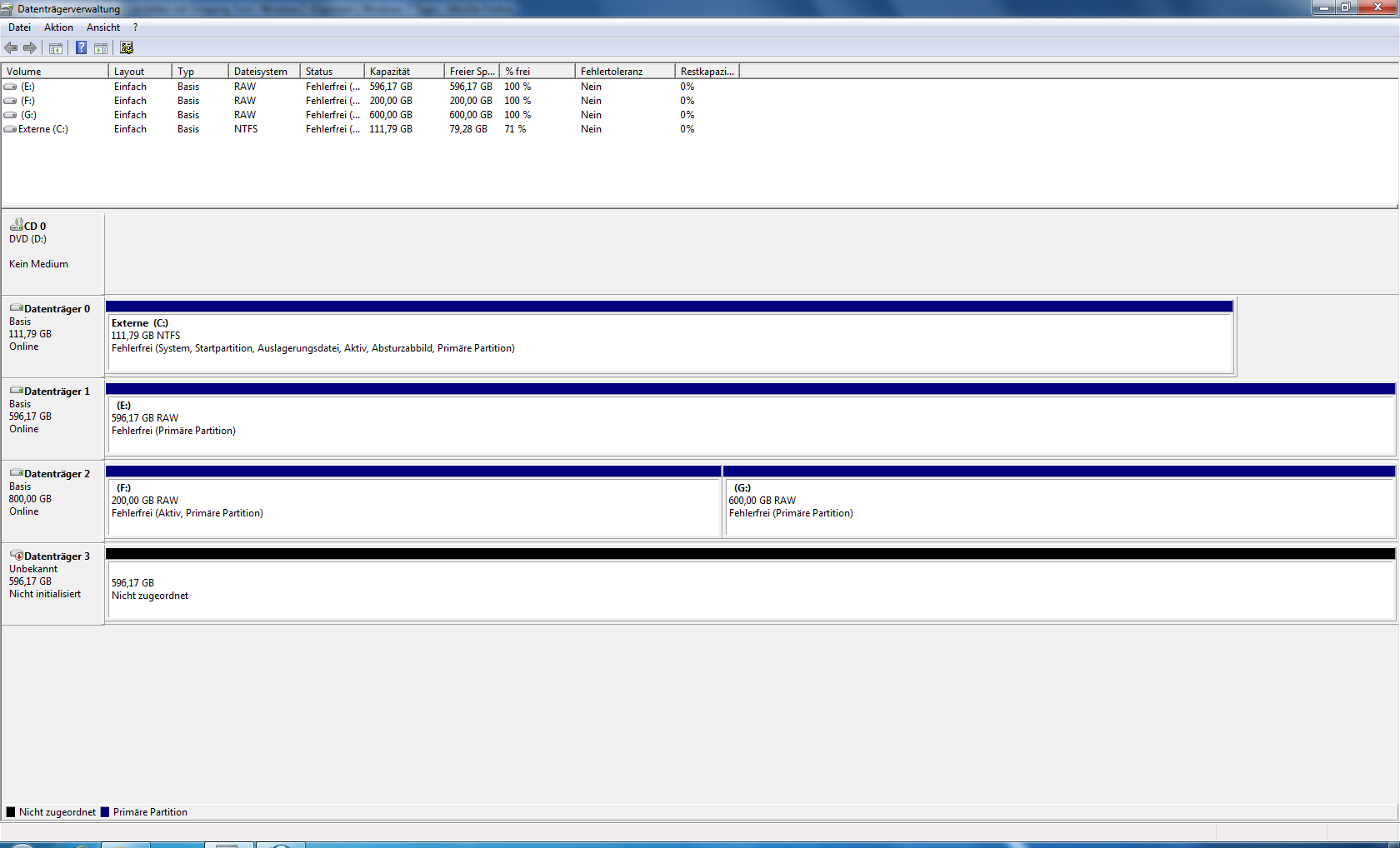Gestern Abend war die Platte an Port 2 dann auf einmal weg. Ok, dachte ich ist ja kein Problem wofür habe ich denn einen Raid 5. Rechner neu gestartet, Platte war wieder da. RaidXPert bot mir an sie wieder einzubinden. Da es schon relativ spät war hab ich das dann aber abgebrochen (vielleicht mein erster Fehler) und dachte "Scheint ein Wackler zu sein, überprüfst morgen in Ruhe mal die Kabel und machst dann die Wiederherstellung".
