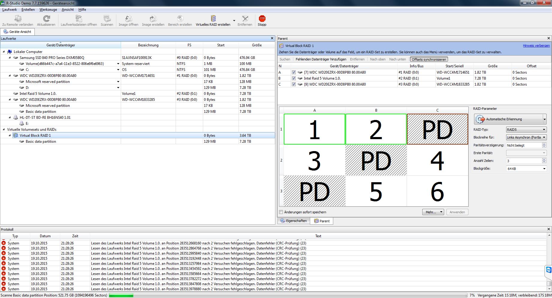 Voraussgesetzt ihr könnt einen Festplattendefekt ausschließen, solltet ihr euch nun an das Klonen der Festplatten mit R-Studio machen. Da ich als Laie lieber eine Kopie als die Quelle zerstöre, finde ich die Virtualisierung von HDDs zum Zwecke der RAID-Wieder-Erstellung verdammt gut.