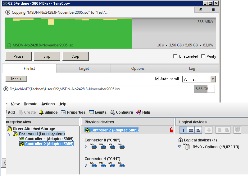 anbei screenshot von eben - R5 auf R5 - hab mal die BBU abgezogen - Adaptec informiert dich immer wenn was nicht stimmt - auch mit akustischem alarm. Auf dem Nas laufen noch 3 VM's also nicht über 500mb/s möglich z.Zt.