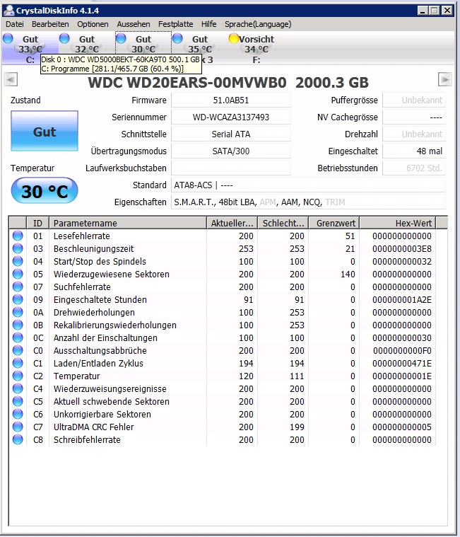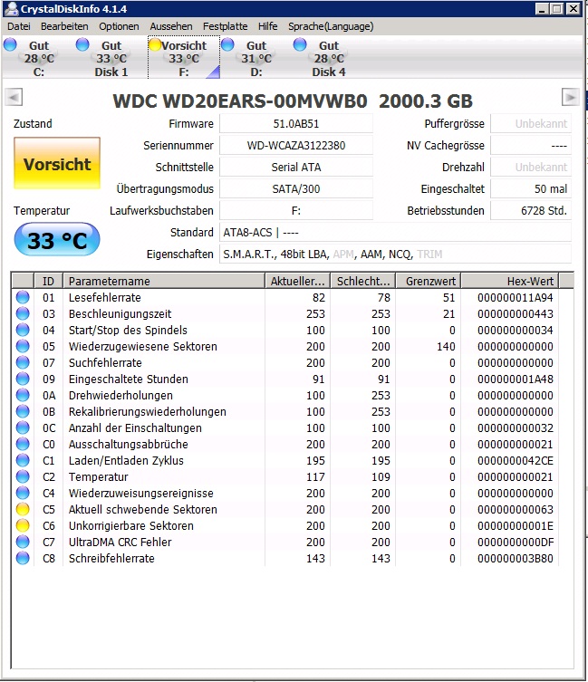 Kabel getauscht oder Anschlüsse am Board gewechselt?ich hatte mal das problem, dass mir im intel manager angezeigt wurde dass 2 platten kaputt wären, da bekam ich dann den tip dass ich diese einfach im intel manager auf normal zurückzusetzen und nach reboot neu mit gpt zu initialisieren. das hab ich damals getan, und es hat alles wieder gefunzt. ohne probleme. hab damals auch 2 kabel gewechselt.