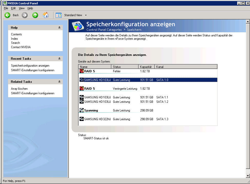 Ich habe ein RAID 5 mit einem onboard NVidia Controller. Gerade eben hab ich mal wieder reingeschaut ob noch alles okay ist. Aber das RAID5 hat ein Fehler (im angehängten Screenshot). Wobei der SMART-Status von allen Platten okay ist.