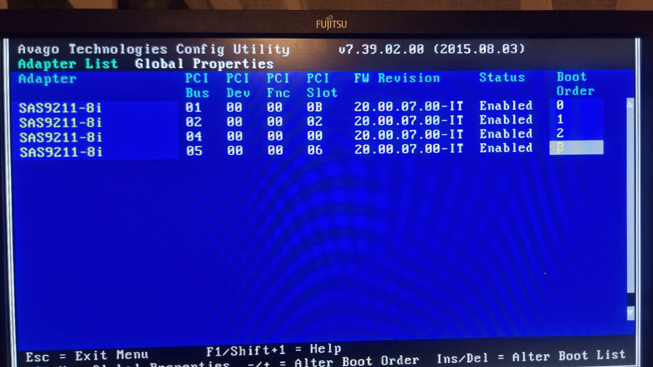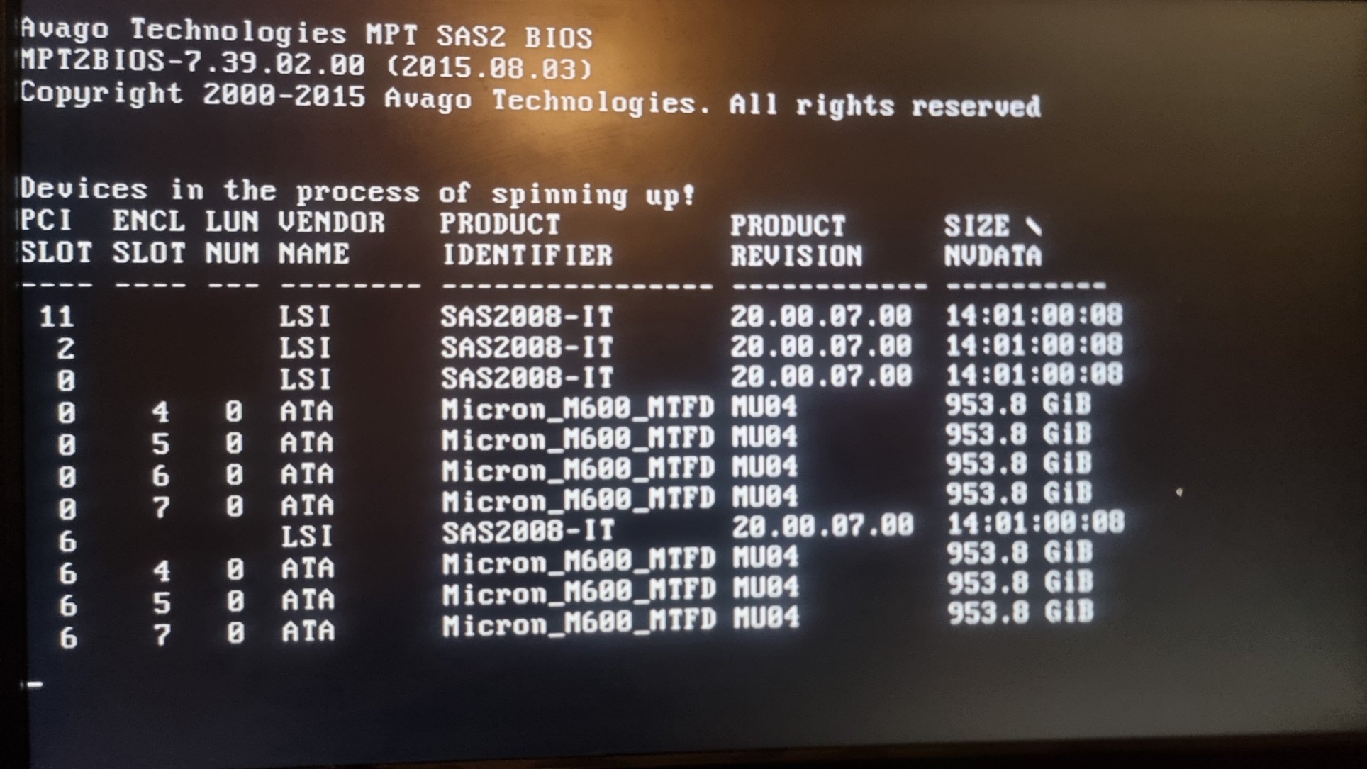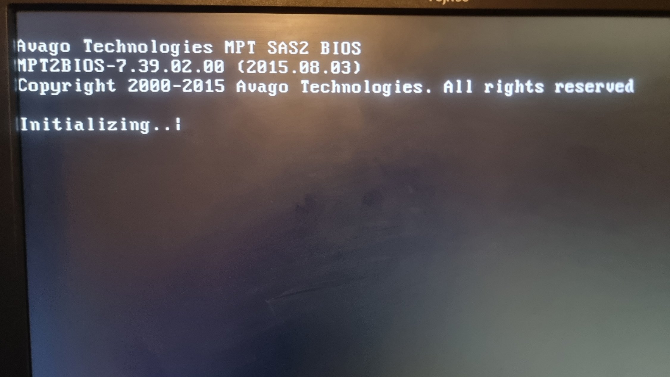 Ich steckte EINE 9211-8i in den PCIe-Slot und startete den Server. Es kam kein LSI-Bootscreen, also die Stelle, an der ich strg+c drücken könnte um ins "LSI-BIOS" zu gelangen.