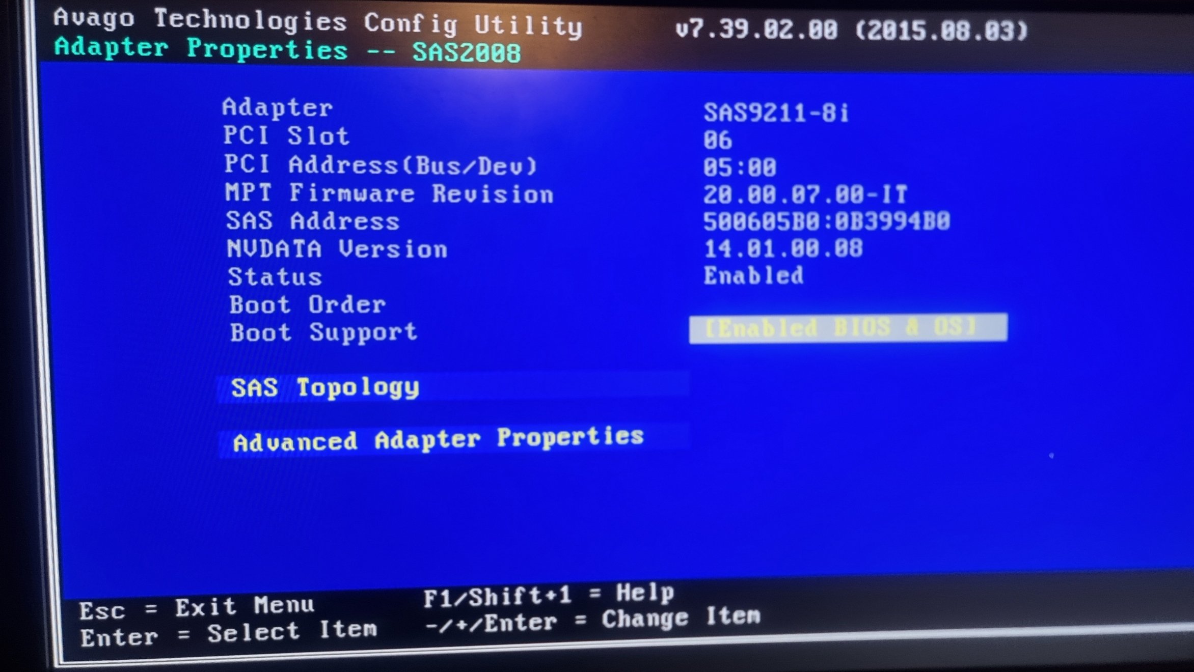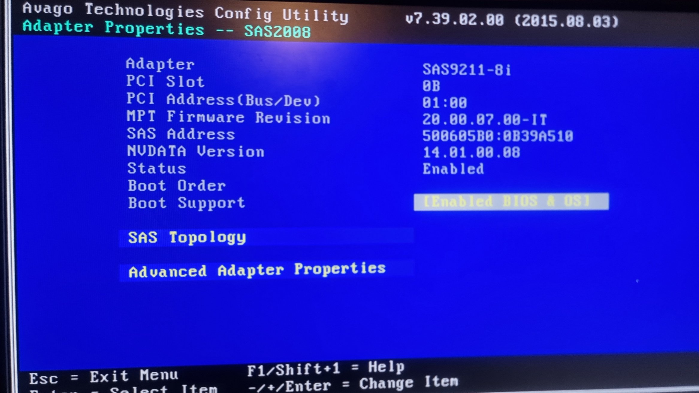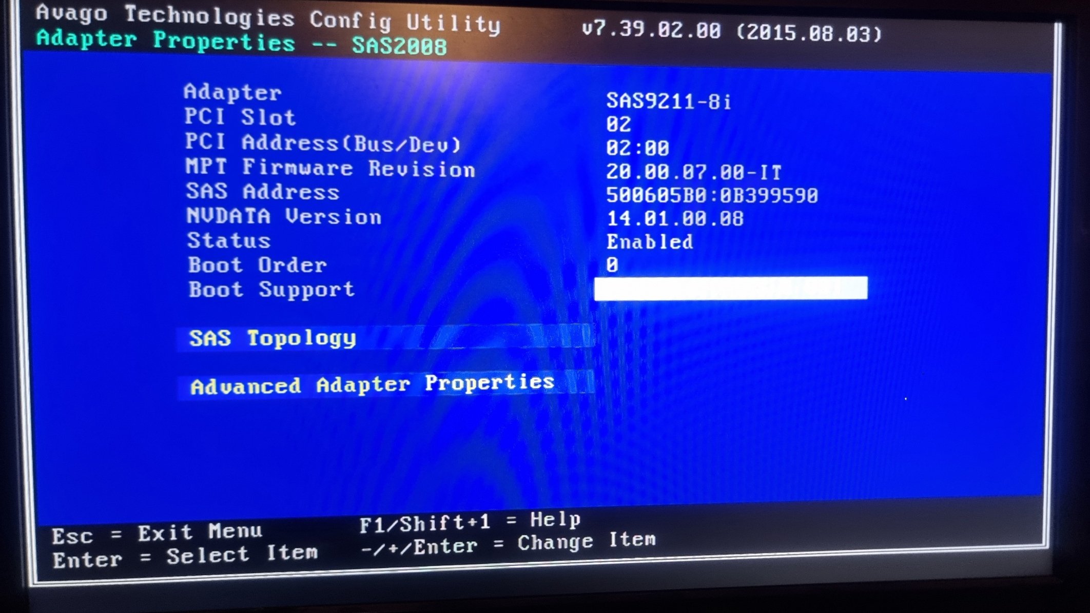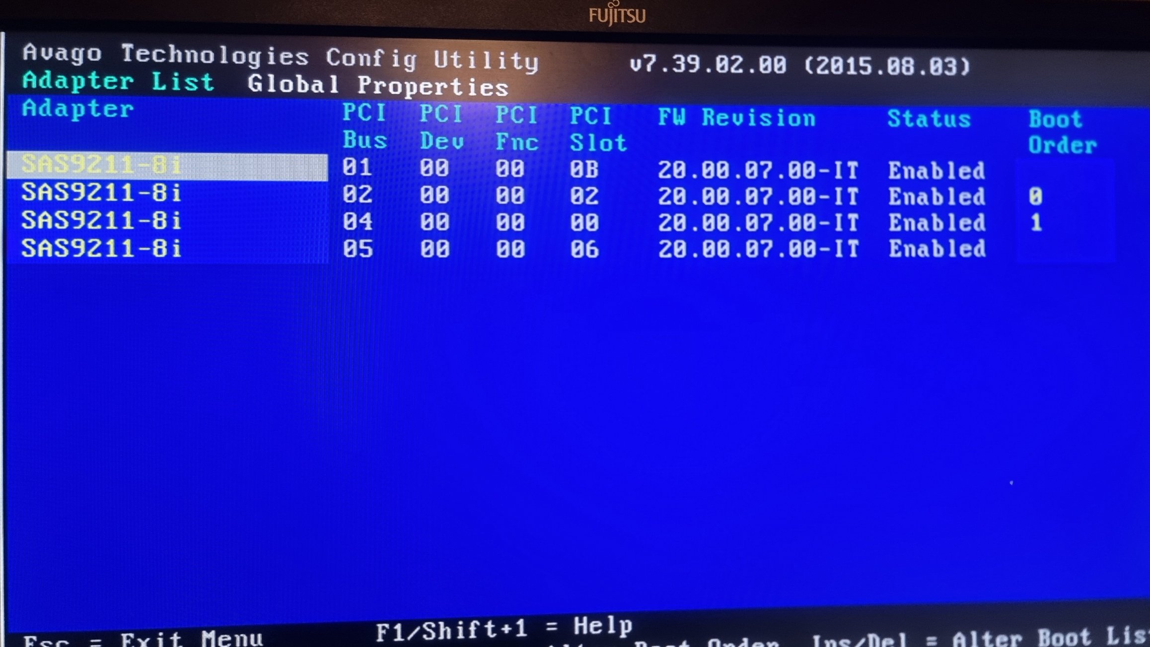 Ich steckte EINE 9211-8i in den PCIe-Slot und startete den Server. Es kam kein LSI-Bootscreen, also die Stelle, an der ich strg+c drücken könnte um ins "LSI-BIOS" zu gelangen.