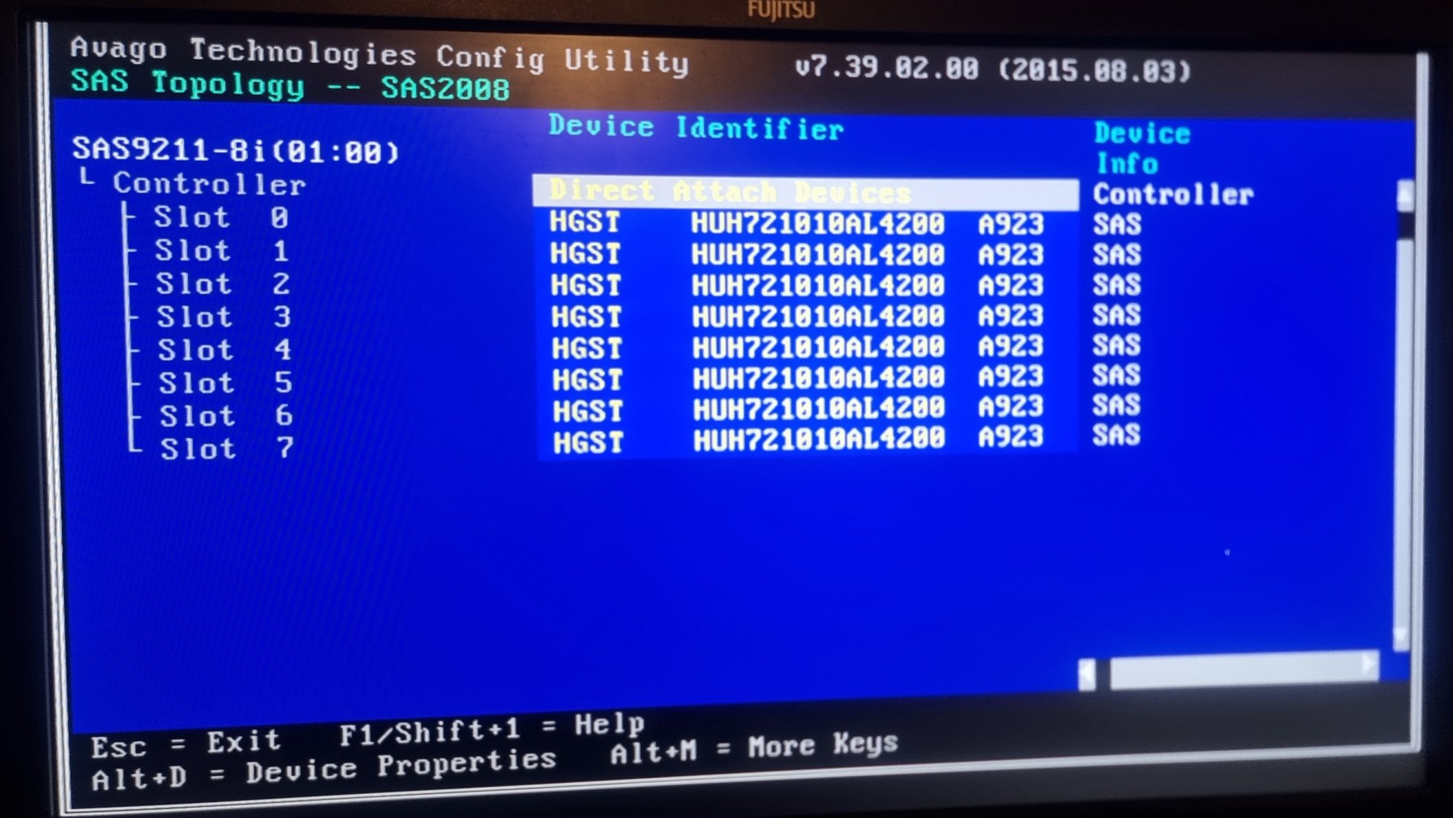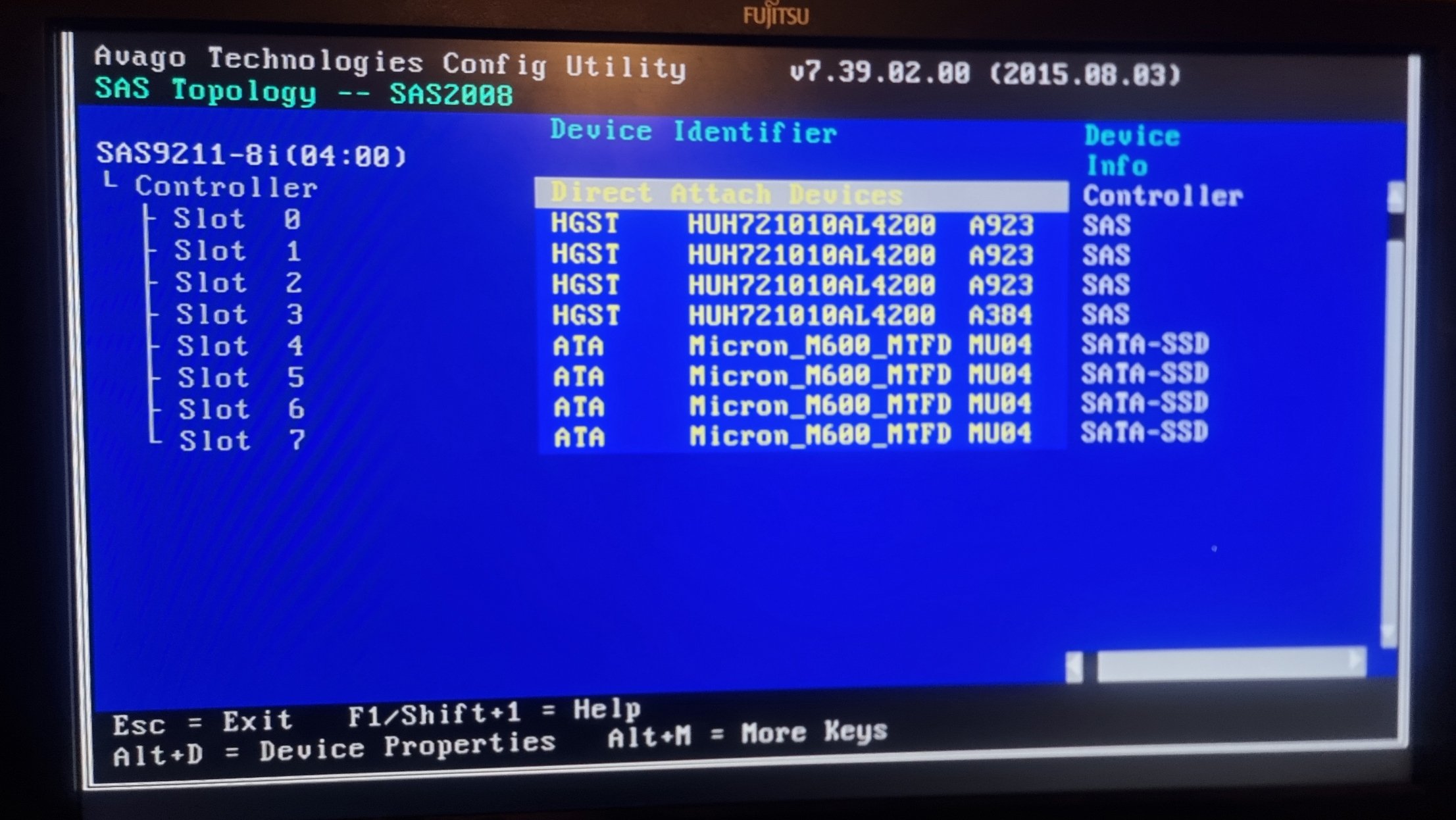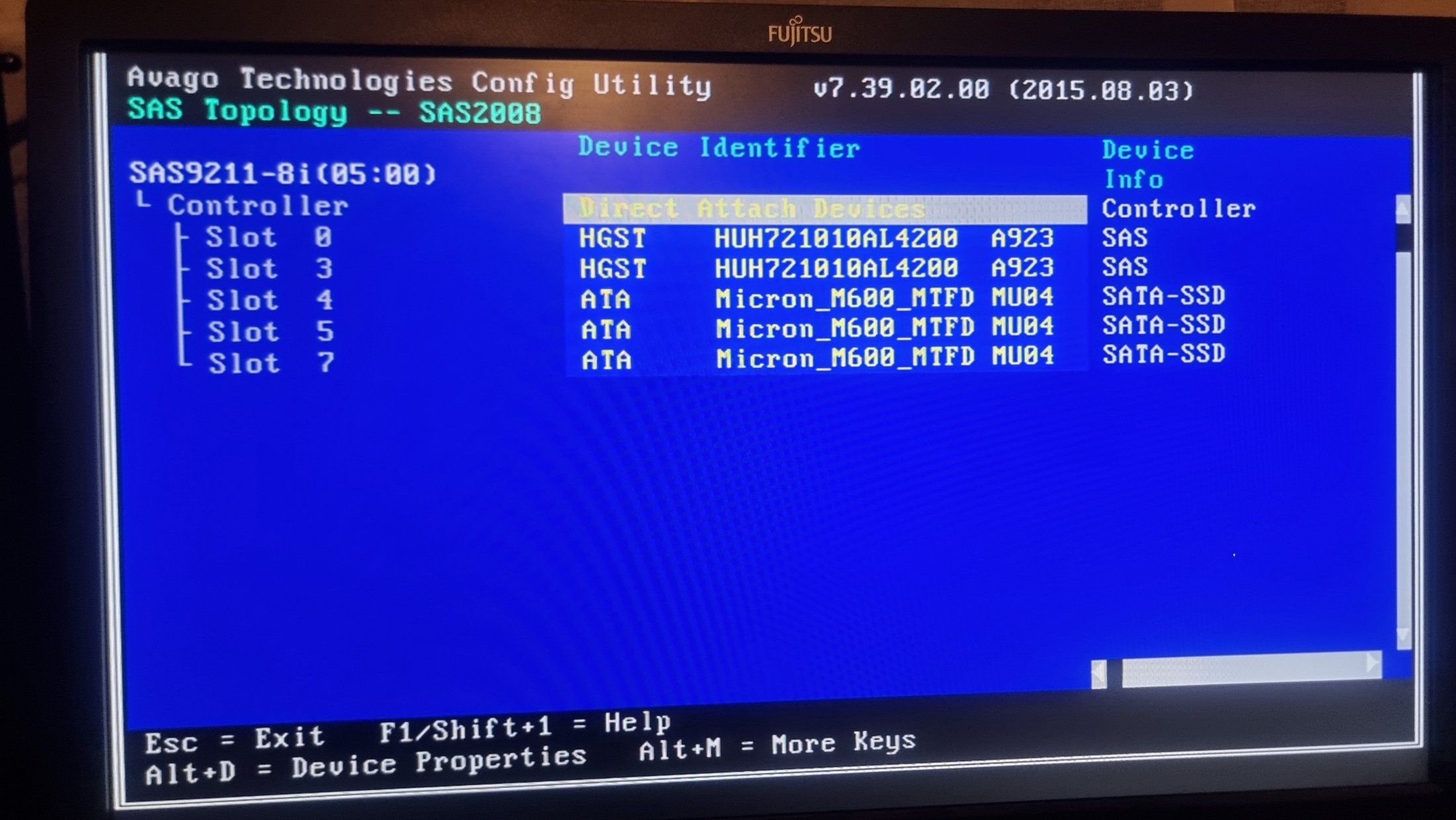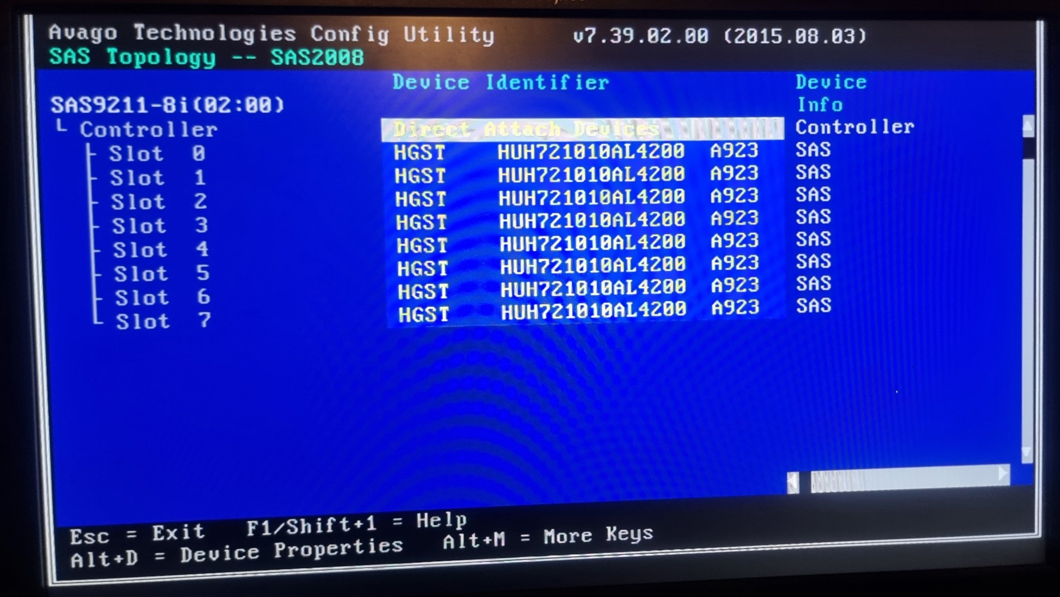 Trotzdem habe ich mal ein bisschen was ausprobiert, weil mir das keine Ruhe gab. Kann ja nicht so schwer sein ein paar Platten über einen HBA Controller an ein Betriebssystem weiter zu reichen.