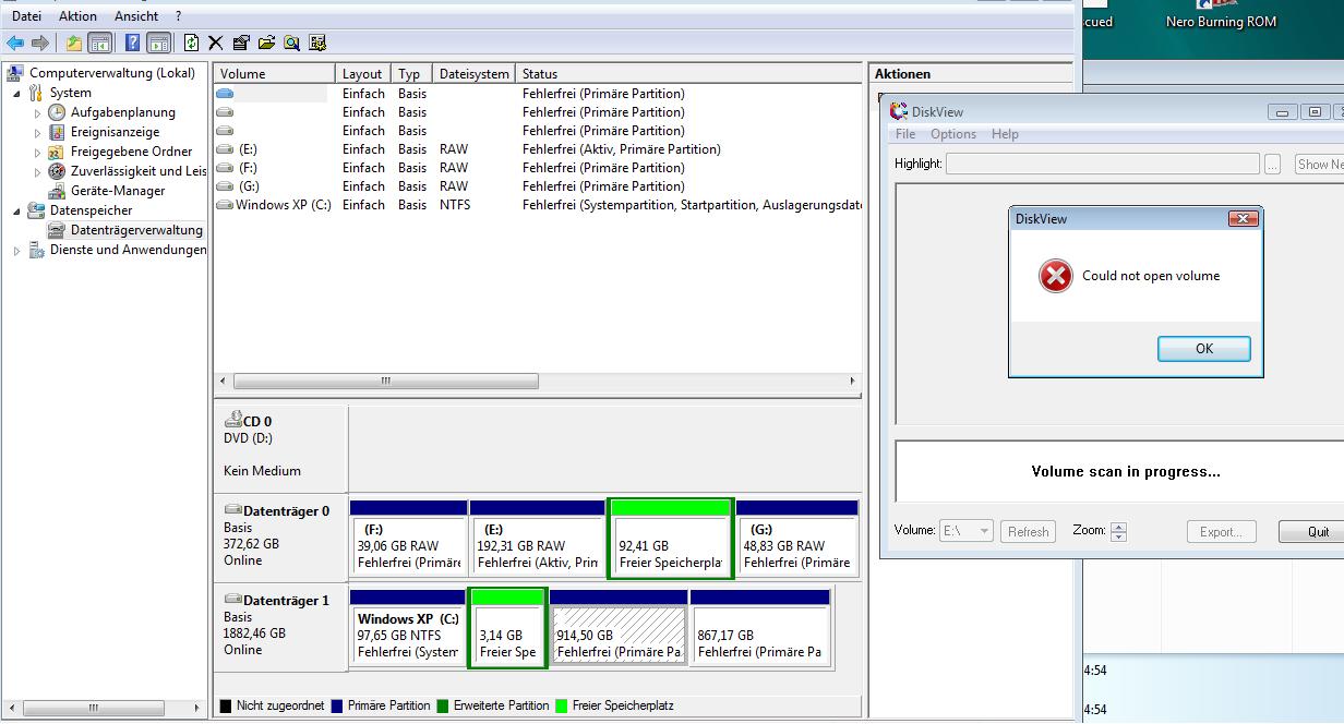 Moment, da stimmt was nicht - die Partitions sind alle RAW das müsste NTFS sein