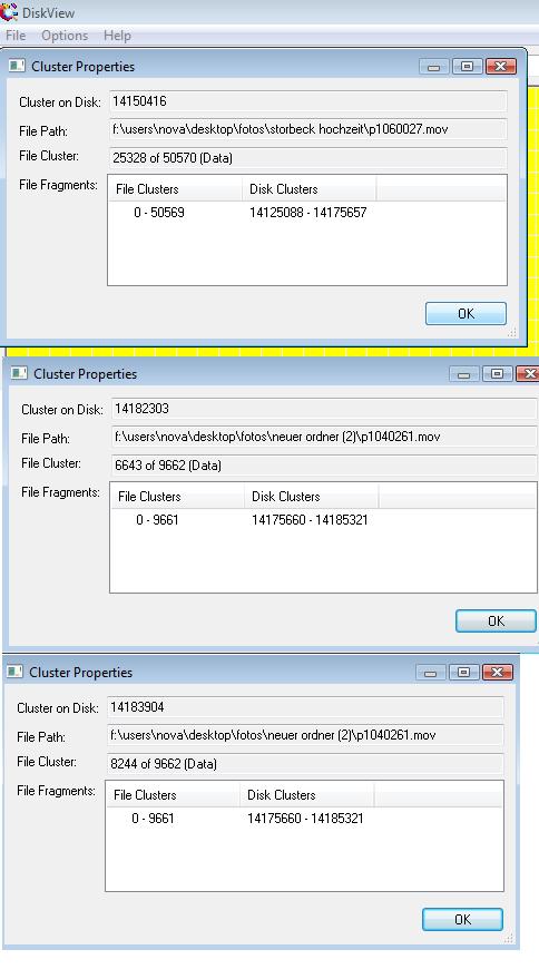 Dummerweise beginnt die Partition nicht an einer 4K-Boundary, daher sind die gesuchten 8 Kästchen mit 4K auf zwei NTFS-Cluster aufgeteilt, die zu verschiedenen Dateien gehören können. jetzt schon, es reicht, wenn Du ein Kästchen gefunden hast, welches zwischen diesen Start-und Endwerten liegt