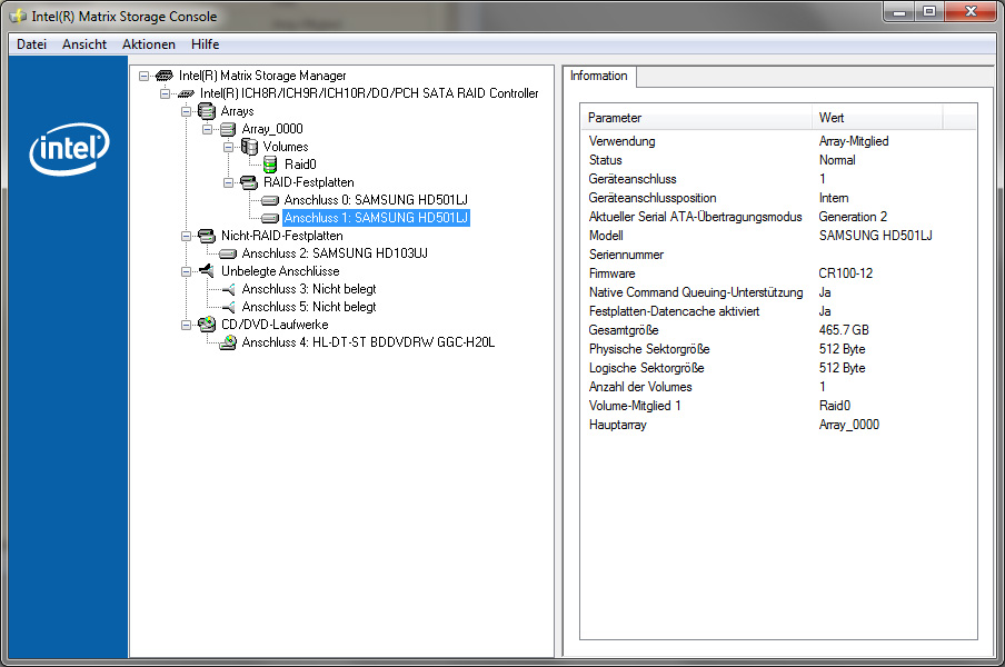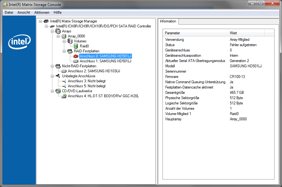 Ich habe dann mal die Diagnose mit dem Intel-Storage-Manager gemacht und der sagt mir: