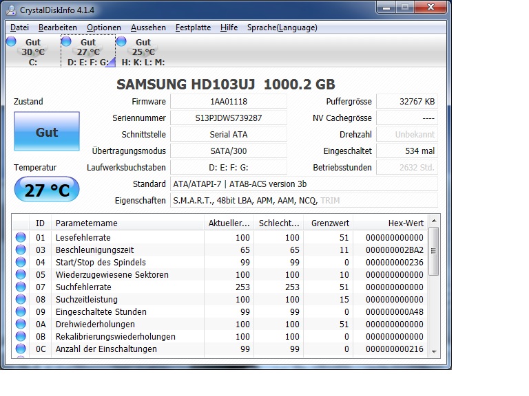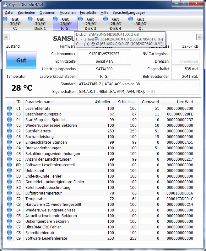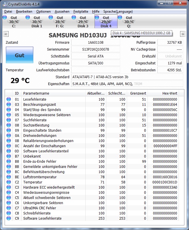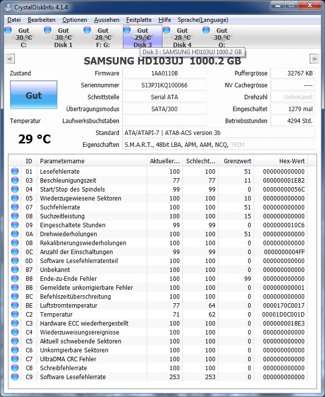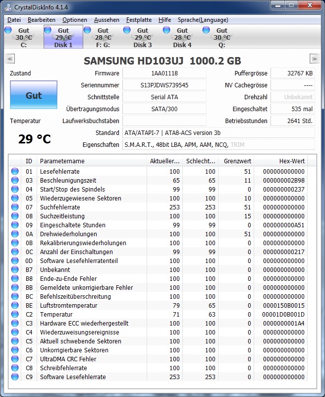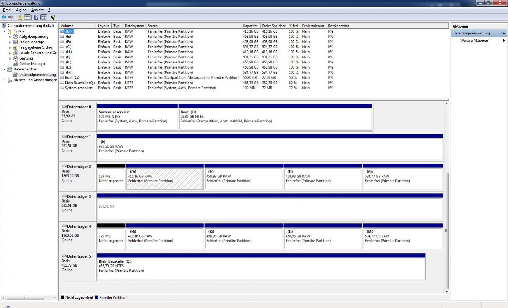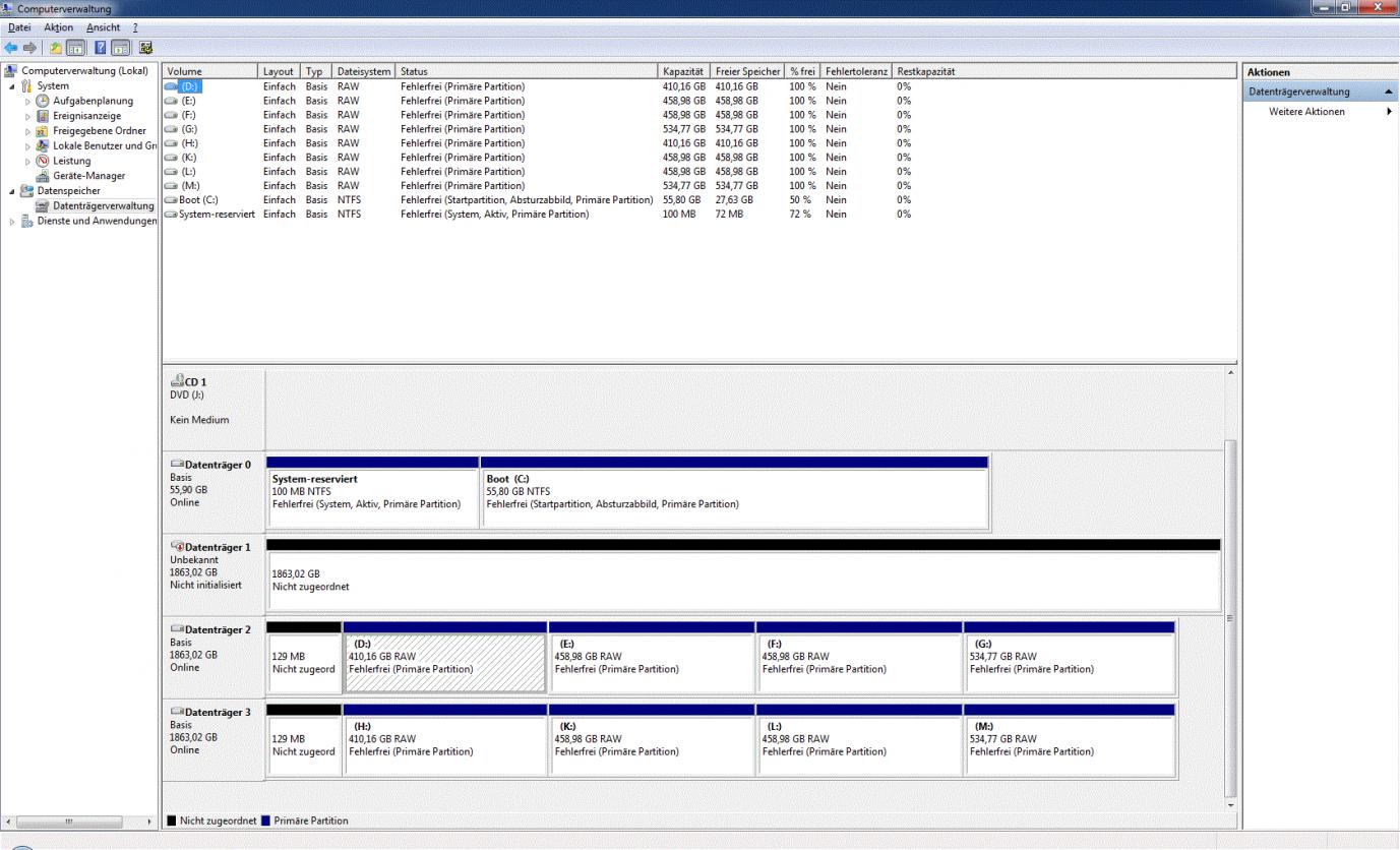 In der Datenträgerverwaltung wird der gesamte raid Verbund angezeigt allerdings ohne Partitionen und obendrüber und untendrunter wird dann jeweils eine der 1TB Samsung Festplatten mit den vorhandenen Partitionen angezeigt! Diese sind allerdings auch alle als RAW.