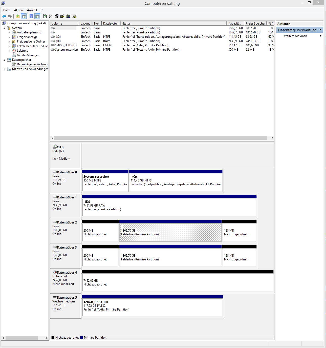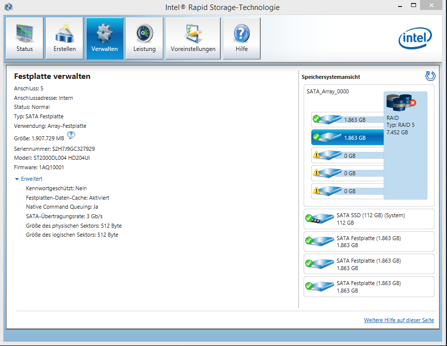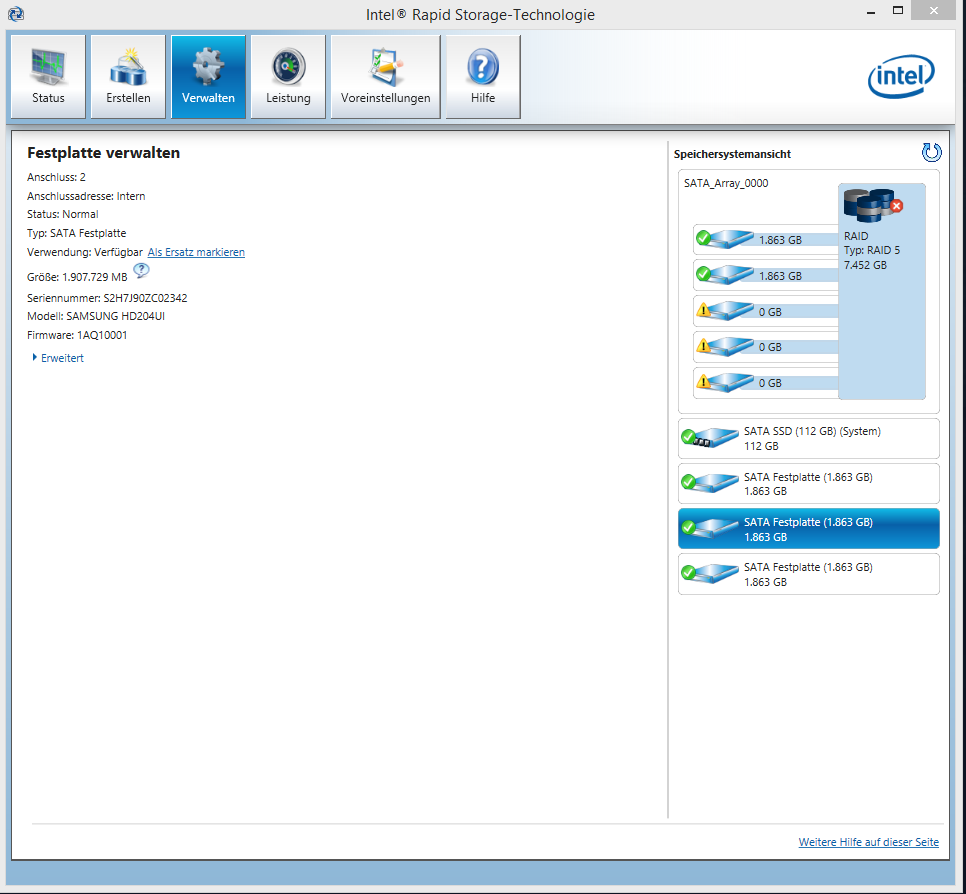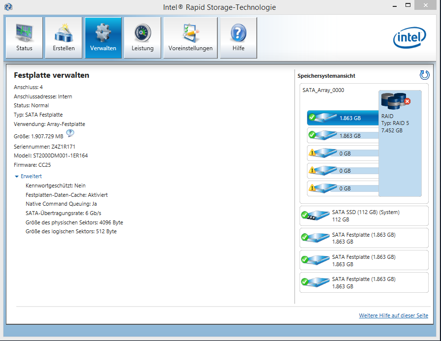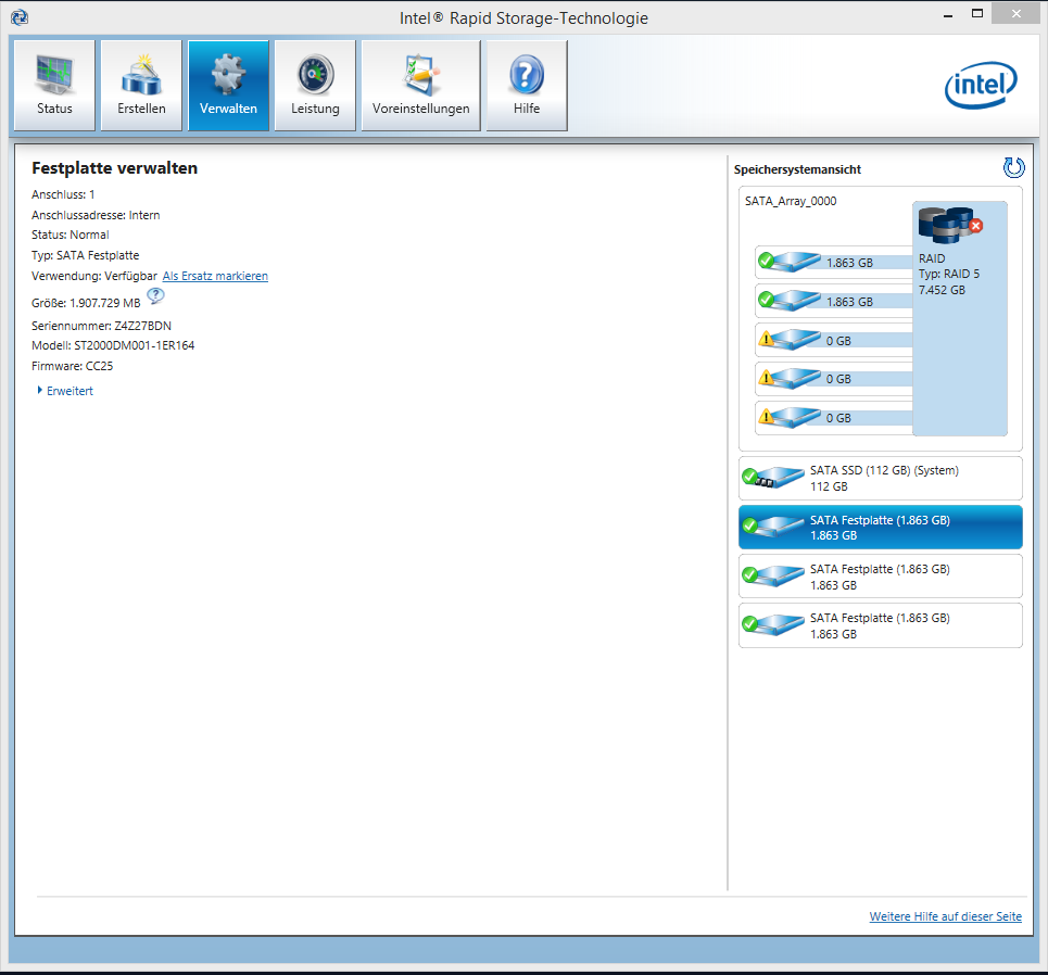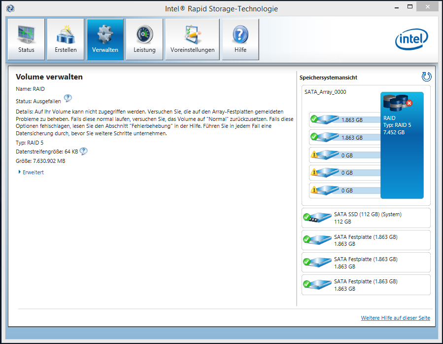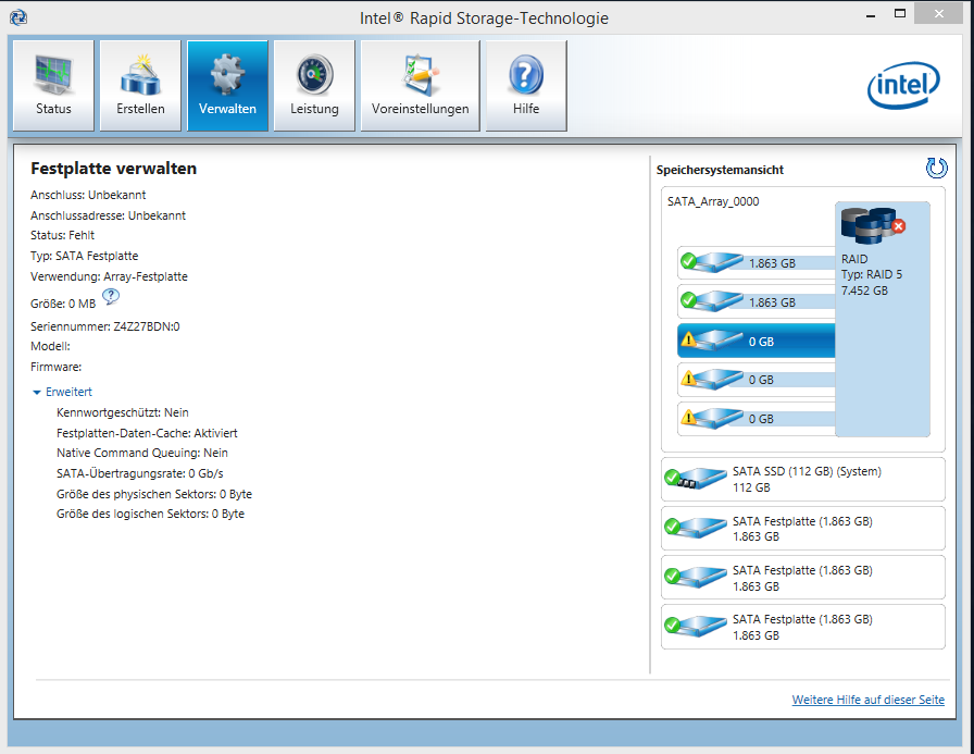 Was ist passiert? Um es kurz zu machen: Bios Update, Platten im INTEL Controller von RAID auf AHCI (meine ich) umgestellt, danach RAID 3 von 5 Member nicht mehr im Spiel.