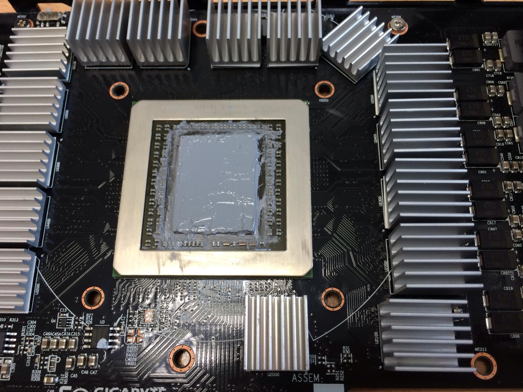Nun muss noch die neue Wärmeleitpaste auf die GPU aufgetragen werden. Hierfür verwende ich die Arctic MX-4. Beim auftragen ist darauf zu achten, das so wenig wie möglich, so viel wie nötig aufgetragen und mithilfe einer alten Scheckkarte oder anderem, dieses auf dem Chip verteilt wird ( klecksmethode und über-kreuz sind recht umstritten in puncto effizienz). Edit sagt: Danke für den Tipp mit dem abmachen etc. aber ich hab im Nachgang nach dem Bild nochmal alles geglättet und überschüssiges entfernt.